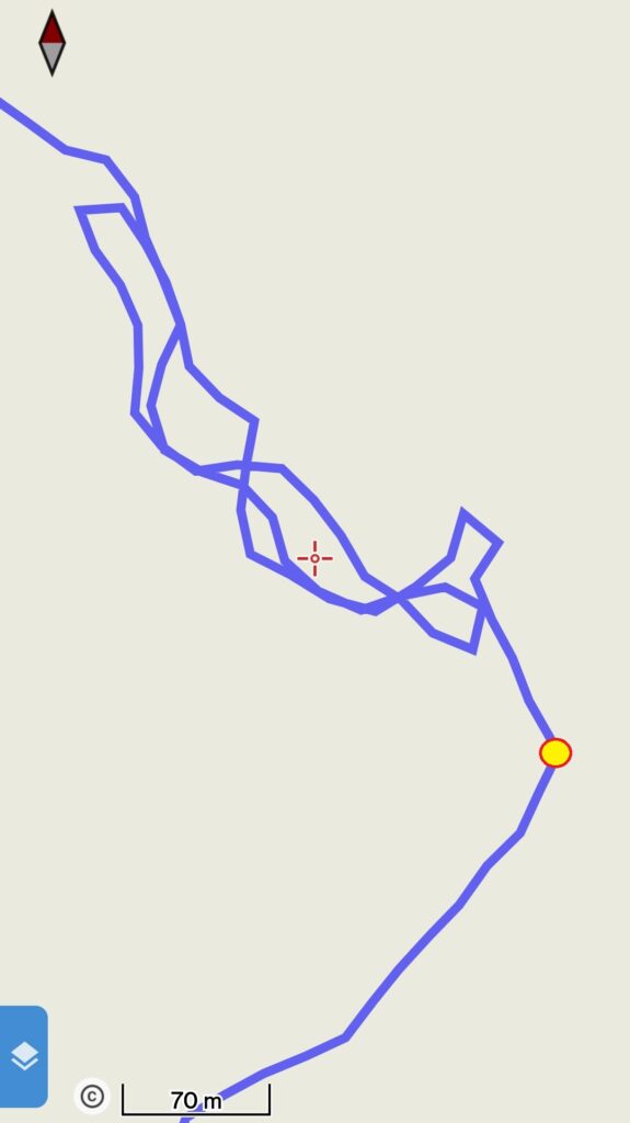 Soviel zur Theorie. In der Praxis gestaltete sich das “etwas” schwieriger, zumindest wenn die Kunst der Triangulation nicht bekannt ist oder man einfach Pech hat und einen schlechten Winkel erwischt. Auf jeden Fall haben wir da einige Runden gedreht. Mit der Zeit kam die Angst auf, dass wir den Löwen vielleicht überfahren haben und deshalb nichts mehr zu finden sei. Auf dem folgenden GPS Track sieht man unsere Irrfahrt und in Gelb der Ort, wo wir den Löwen schlussendlich gefunden haben. Wohl bemerkt, die ganze Strecke war offroad, was soviel bedeutet, wie Festklammern, Stabilisieren und die Atmung koordinieren. 😉