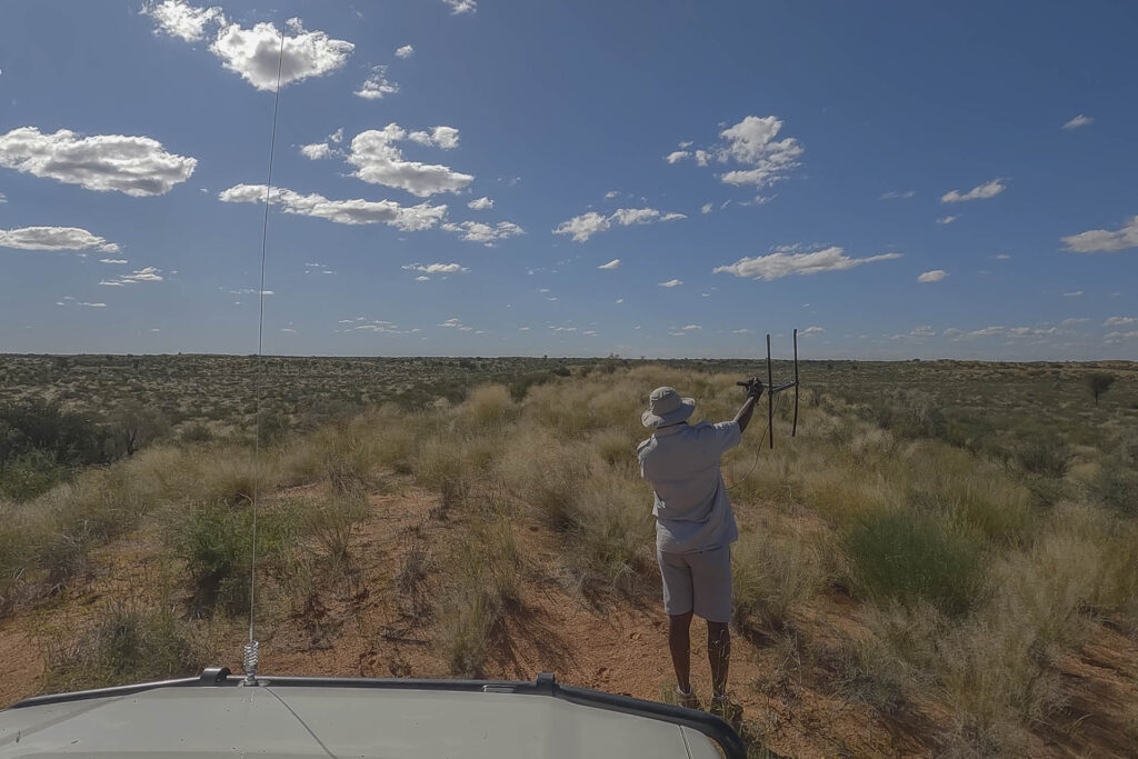 Angesichts der Grösse des Reservats und der Tatsache, dass sich gerade einmal 12 Löwen darin befinden, muss Technologie her, um die Löwen in sinnvoller Zeit (d.h. vor dem Sundowner) zu finden. Drei der Löwen haben ein Halsband mit Sender an, was mit einer Antenne eine ungefähre Ortung zulässt.