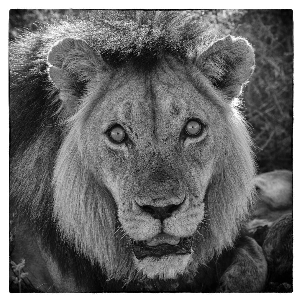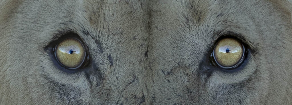 Wenn du dein Safari-Fahrzeug in den Augen des Löwen spiegeln siehst, dann weisst du, du bist nahe dran. Weiss der Löwe auch, dass er ebenfalls nahe dran ist, nahe am nächsten Lunch? Hoffentlich nicht…