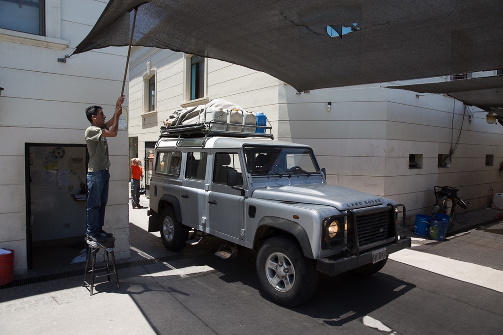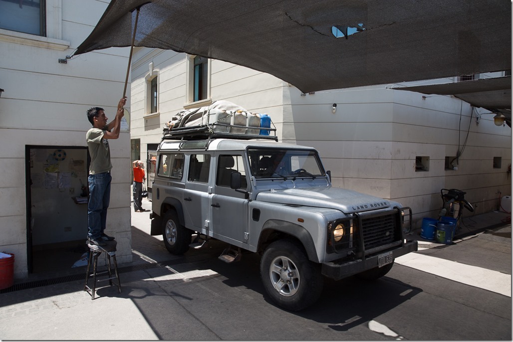 In den Städten gibt es häufig bewachte Parkplätze. Unser Fahrzeug war etwas hoch für diesen, aber mit etwas Nachhelfen ging es auch.