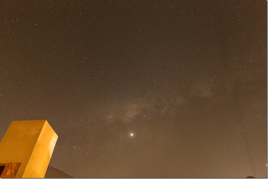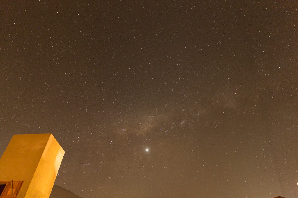 Heute war der Himmel erstmals wolkenlos. Allerdings hatte es noch eine deutliche Dunstschicht und das Streulicht des Hotels gab den Rest, so dass mein erstes Himmelsfoto nicht sonderlich gut wurde. Bei dieser Gelegenheit musste ich auch feststellen, dass das Sternzeichen “Kreuz des Südens”, das man für die Ausrichtung des Fotoapparates gut verwenden kann, um diese Zeit unter dem Horizont liegt … die anderen Methoden sind alle deutlich komplizierter
