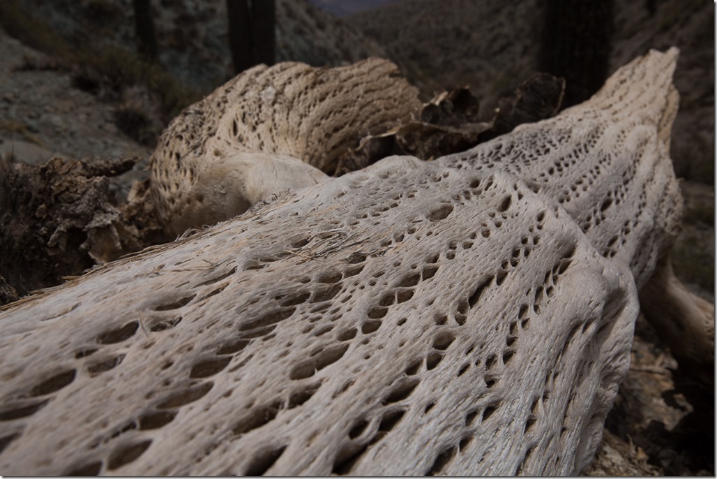 Es sind die Reste von einem Kaktusstrauch. Aus diesem Kaktusholz werden hier sehr viele Dinge gefertigt. So zum Beispiel habe ich schon Fensterrahmen, Deckenverkleidungen oder Lampen gesehen, die aus diesem luftigen, aber dennoch einigermassen stabilen Holz gefertigt werden. Hier sieht man nochmals einen Kaktus, der sich noch erfolgreich der Weiterverarbeitung widdersetzt hat.