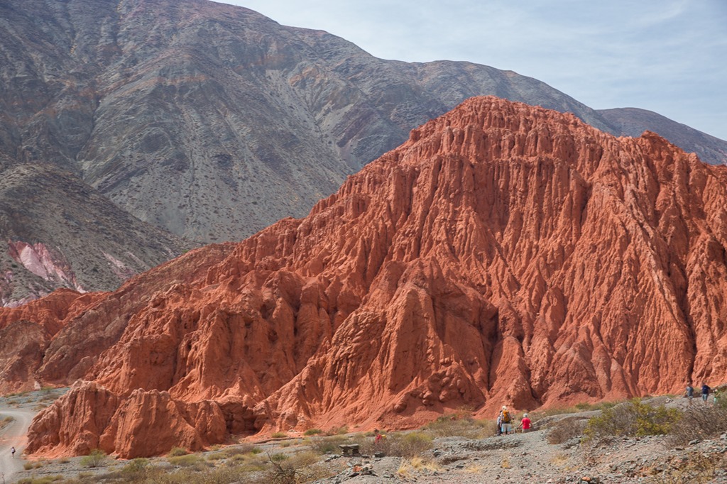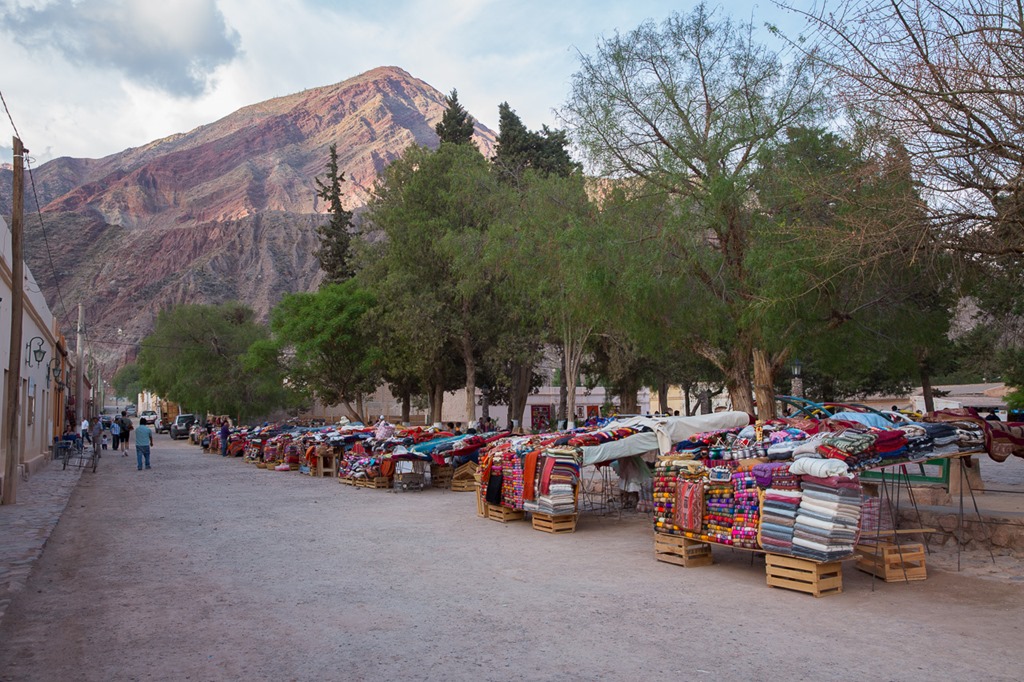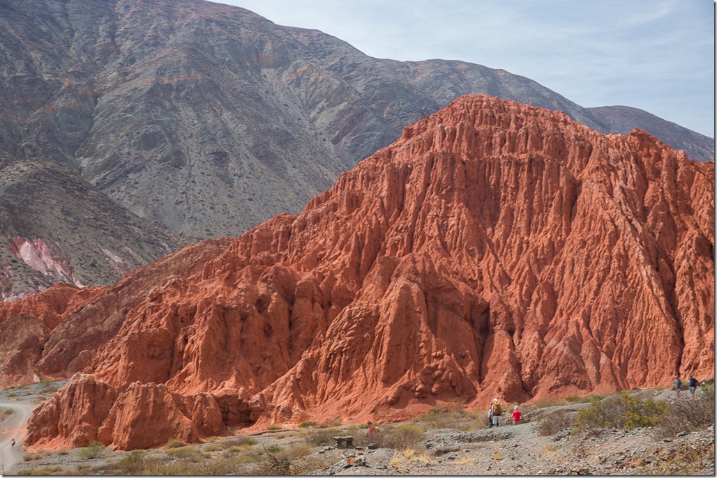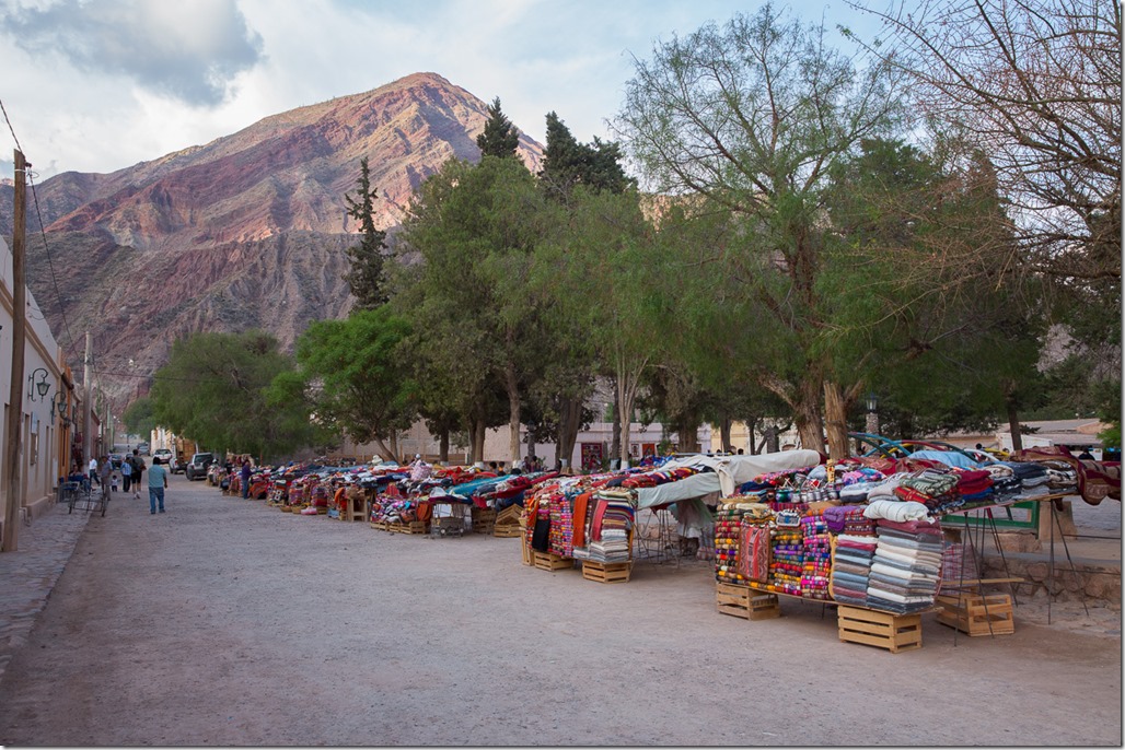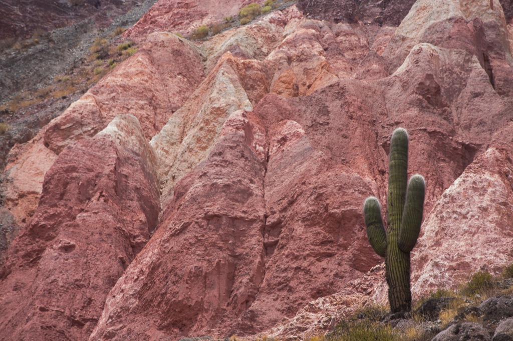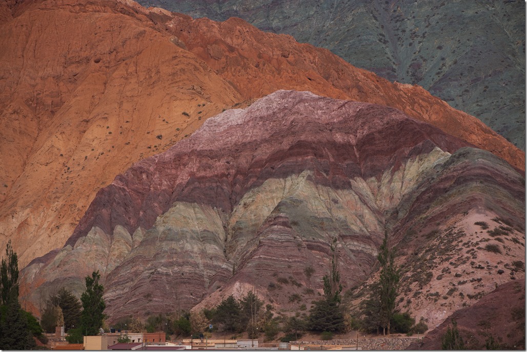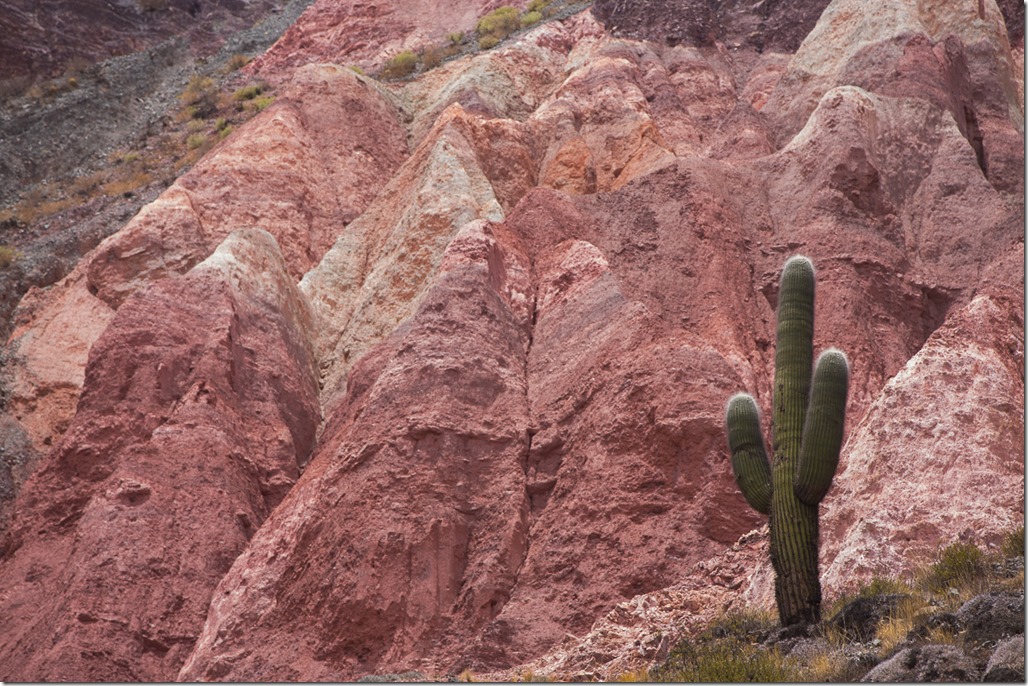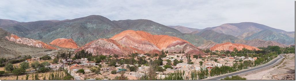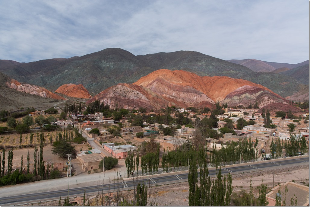 Purmamarca ist touristisch einigermassen erschlossen, da es am Fusse des “Cerro de los siete Colores” –  “der Berg der sieben Farben” liegt und über asphaltierte Strassen verfügt.  Jetzt bei Tageslicht wurde uns das auch bewusst. Einerseits konnten wir einen Blick auf dem Berg werfen, anderseits sahen wir in unserem Hotel auch die ersten anderen Touristen! Für einen wirklich schönen Blick auf den Berg mussten wir aber erst noch 15 Minuten weit gehen und dann noch etwas in die Höhe steigen. Quasi ein Geheim-Tipp, denn der offizielle “Flipflop”-Aussichtspunkt liegt direkt an der Strasse, bringt aber auch die gesamt Stromzufuhr von Purmamarca mit ins Bild.  Wunderschön das Farbspiel.