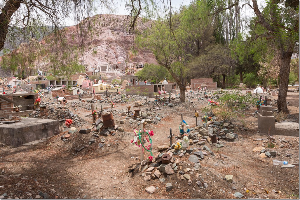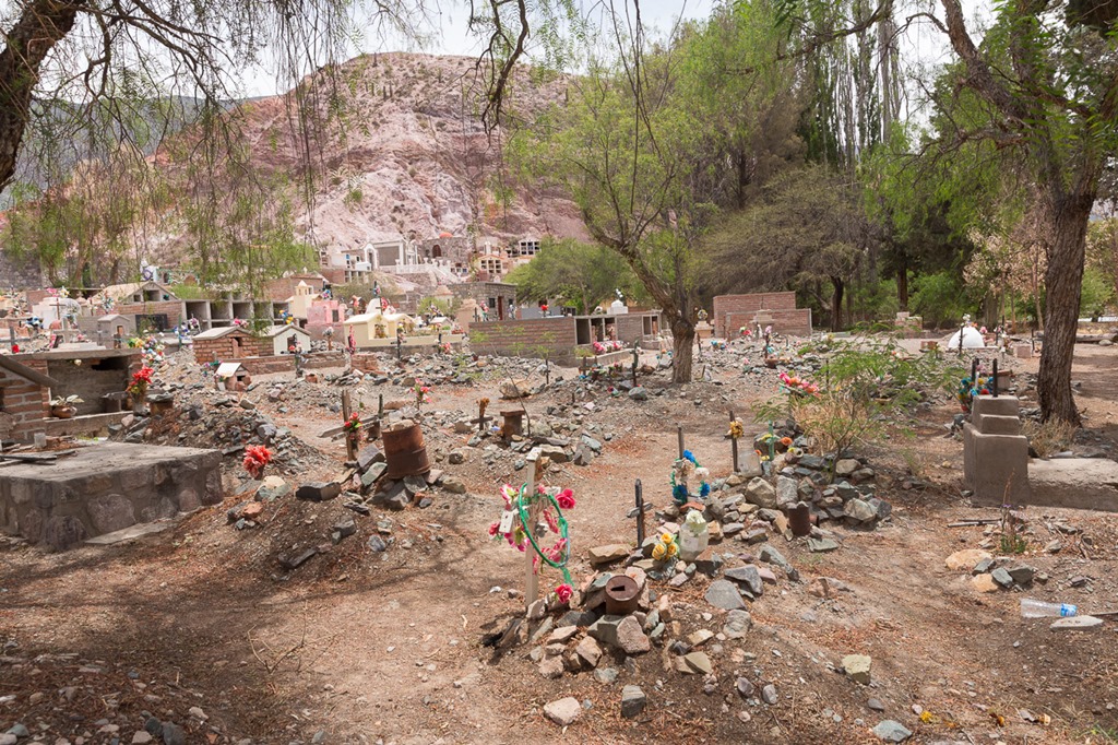 Kurz bevor wir wieder Purmamarca erreichten ging unser Weg am Friedhof des Dorfes vorbei. Es sieht für unsere Augen etwas trostlos aus, ist hier aber der Standard. Wohl nur ganz reiche Familien können sich ein kleines Haus auf dem Friedhof leisten.