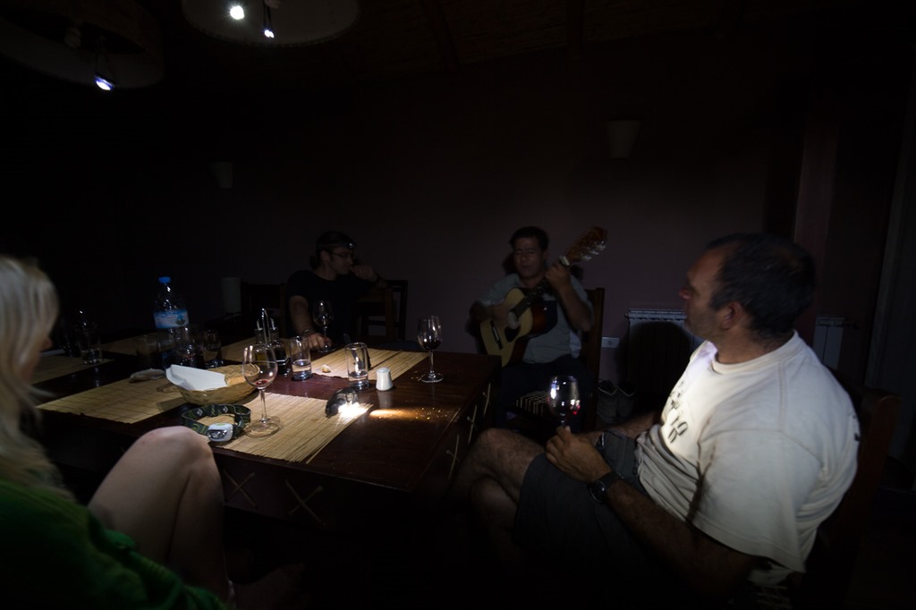 Während des Nachtessens war der Strom plötzlich weg. Deshalb wurden unsere Stirnlampen schnell zur Deckenbeleuchtung umfunktioniert. Erst nach Stunden war wieder Strom. Nach dem Nachtessen gab es ein paar Argentinische Lieder, vorgetragen von einem Arbeitskollegen von unserem Fahrer Pablo
