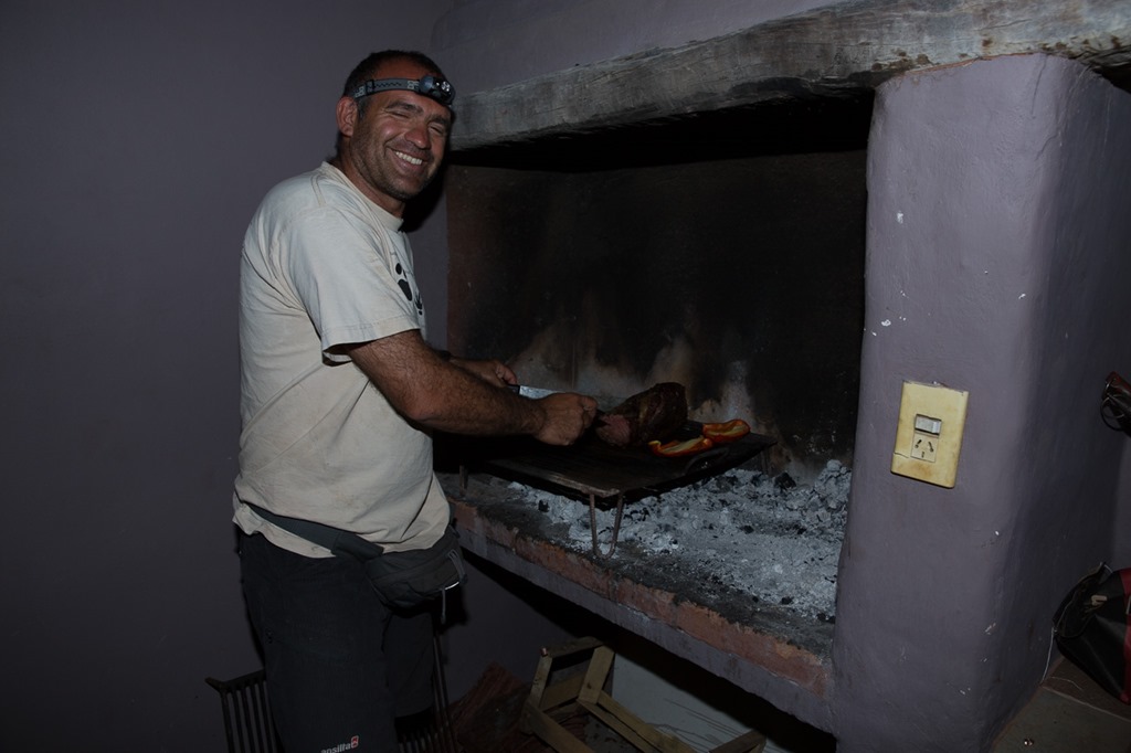 Das heutige Nachtessen wurde von unserem Fahrer gekocht. Er war der “Asador”, der Grillmeister. Die Technik des Grillierens ist äusserst interessant. Keine Ahnung, wieso sie bei uns keine Verwendung findet: Auf der einen Seite des Grillplatzes macht man ein Feuer und wartet bis gute Glut vorhanden ist. Dann wird etwas von der Glut auf die andere Seite unter den Grill geschoben, auf dem dann das Fleisch platziert wird. Das eigentliche Feuer wird während des ganzen Grillvorgangs am Brenne gehalten und stellt somit sicher, dass man bei Bedarf immer wieder neue Glut unter den Grill schieben kann. Die Methode kann man als Niedertemperaturgaren auf dem Grill bezeichnen, mit Holz und nicht Gas!