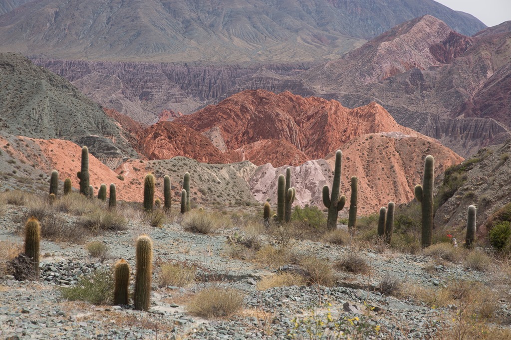 Da wir gestern bei Dunkelheit in Purmamarca angekommen waren, konnten wir noch nicht die Landschaft sehen, in die wir eigentlich gefahren waren. Die Fahrt ging ja durch das riesige Tal des Flusses “Rio Grande”. Dabei muss man sich ein Tal von mindestens 500m Breite vorstellen, dass mit Kies und auch grösserem Gestein gefüllt ist. In diesem Gesteinsfeld hat sich der Fluss dann seinen Lauf gespült. Der Verlauf ist aber nicht für immer so. Nach stärkeren Regenfällen kann es vorkommen, dass der Fluss sich einen anderen Weg aussucht. Strassen und auch Häuser liegen am Seitenrand des Tales und auf Anhöhen. Sicher gibt es auch künstlich angelegte und begradigte Flüsse, ich habe sie aber bis jetzt noch nicht gesehen.