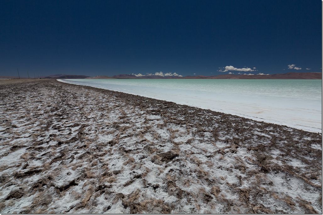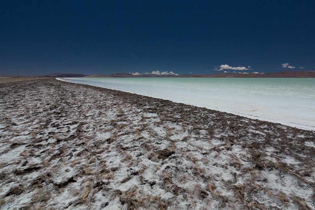 Diese Lagunge wird durch die Lithium Förderung erzeugt. Man kann hier am Rande auch deutlich sehen, dass eine (ausgetrockneter) Salzsee nicht automatisch eine glatte, weisse Oberfläche bedeutet. In diesem Fall ist die Oberfläche sehr holprig. Die Entstehung hängt von verschiedensten Faktoren, wie zum Beispiel Wind, Bodenbeschaffenheit und auch Salzdicke ab.
