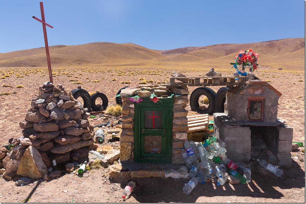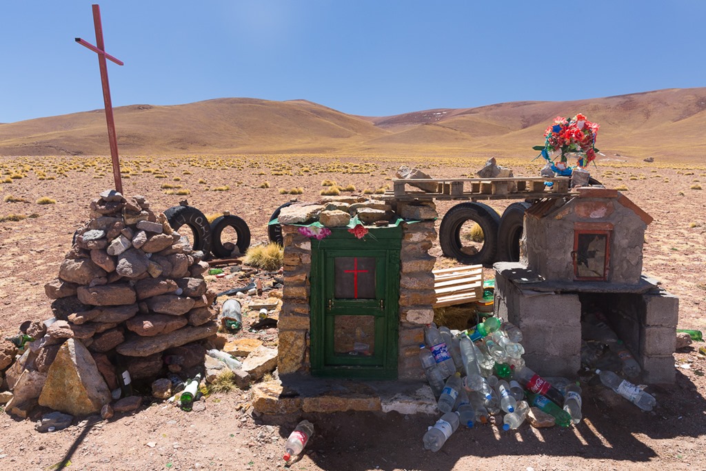 Fast auf allen Pässen bietet sich folgendes Bild. Ohne Wissen der lokalen Bräuche könnte man meinen, dass es sich um eine Mülldeponie von Pet/Glass-Flaschen handelt. Doch weit gefehlt! Es handelt sich um Opfergaben an “Mutter Erde” für eine sichere Fahrt. Auf der rechten Seite ist dann eine christliche Figur, der Name ist mir leider entfallen, die gleiches bezwecken sollte. Man hat also eine Vermischung zwischen dem katholischen Glauben und Naturreligionen.