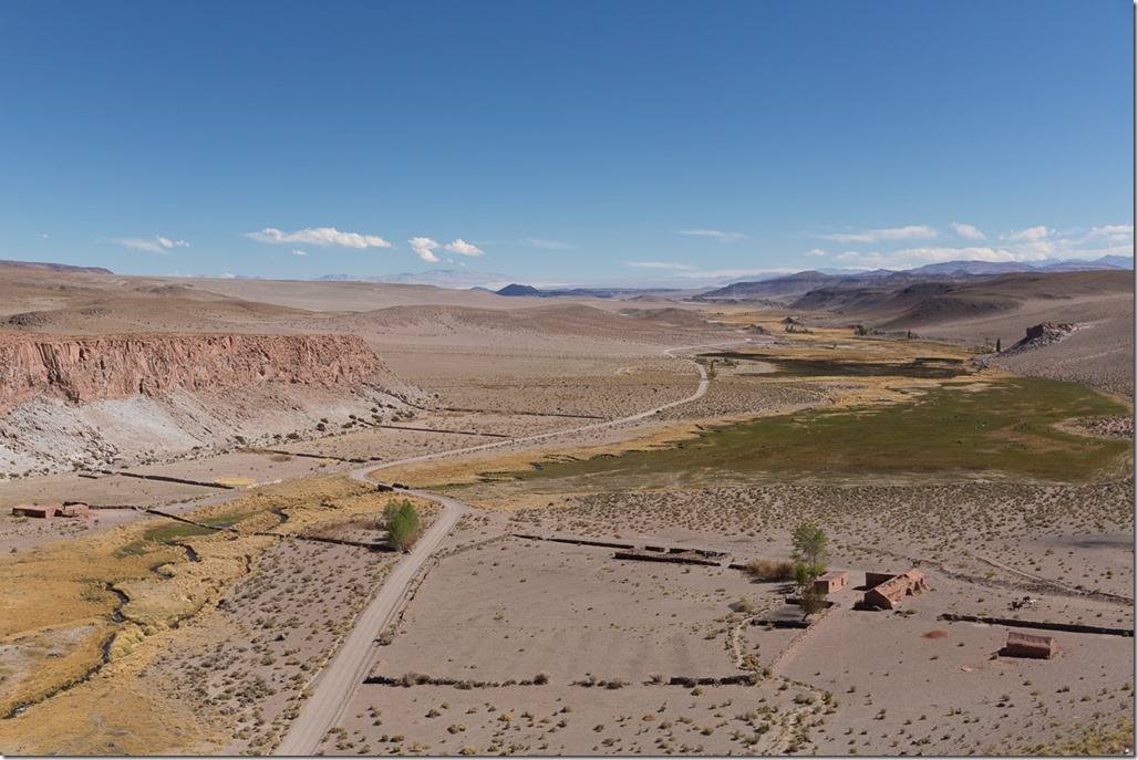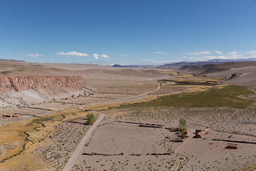 können wir bald schon die Hochebene sehen, in der sich unsere Unterkunft für die nächsten zwei Tage befindet. Antofagasta de la Sierra ist der Name und das wir hier hoch sind kann man einzig dem GPS ablesen: 3400m, Referenzpunkte wie zum Beispiel die Temperatur fehlen, es ist nämlich immer noch ganz schön war.