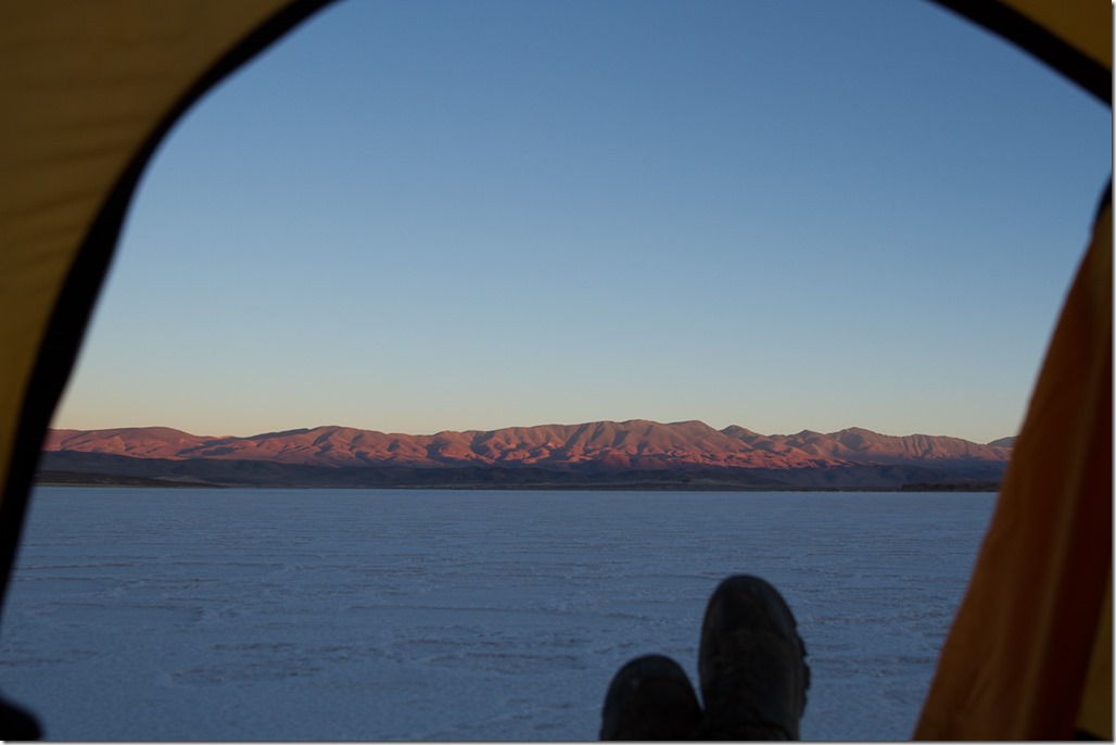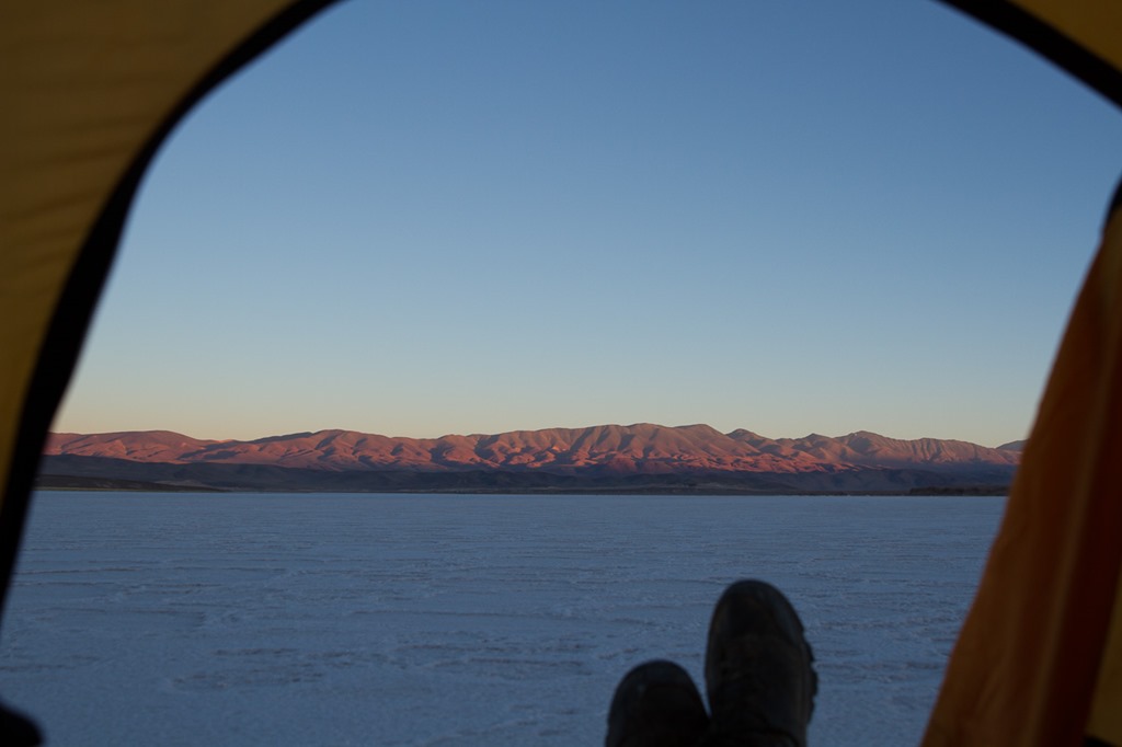 Blick aus meinem Zelt auf die von der aufgehenden Sonne beleuchteten Berge.