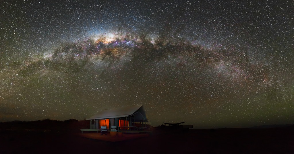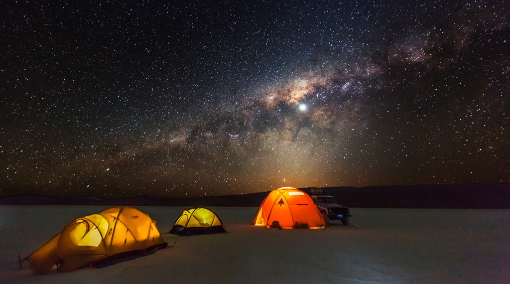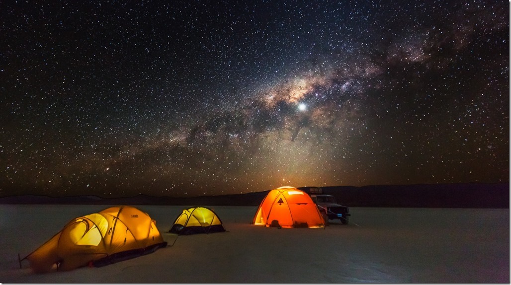 Eigentlich wurde mein schlummerndes Interesse schon vor zwei Jahren auf der Reise nach Argentinien geweckt. Dafür hatte ich eigens einen “Barn-Door” Tracker gebaut, der die Rotation der Erde ausgleicht und so längere Belichtungen zulässt. Die Faustregel für nicht nachgeführte Aufnahmen ist nämlich 500/Brennweite = maximale Belichtungszeit. Wenn man also mit einem 24mm Objektiv fotografiert, kann man maximal 20 Sekunden belichten. Leider entpuppte sich das Vorhaben mit dem Barn-Door Tracker als Reinfall. Nicht weil das Ding nicht lief, sondern weil auf der Reise am frühen Abend immer sehr starker Wind herrschte und dem Super-Light-Travel-Marco-Spezial-Barn-Door Tracker doch arg zusetzte. Lange Rede kurzer Sinn, es gab deshalb auf der Reise keine nachgeführten Astro-Bilder. Ich musste mich also an die 500er Regel halten. Dass damit aber durchaus auch schöne Bilder gemacht werden können, zeigt das folgende. Wir haben auf einem Salzsee mit Zelten übernachtet.