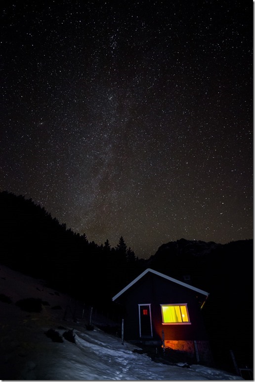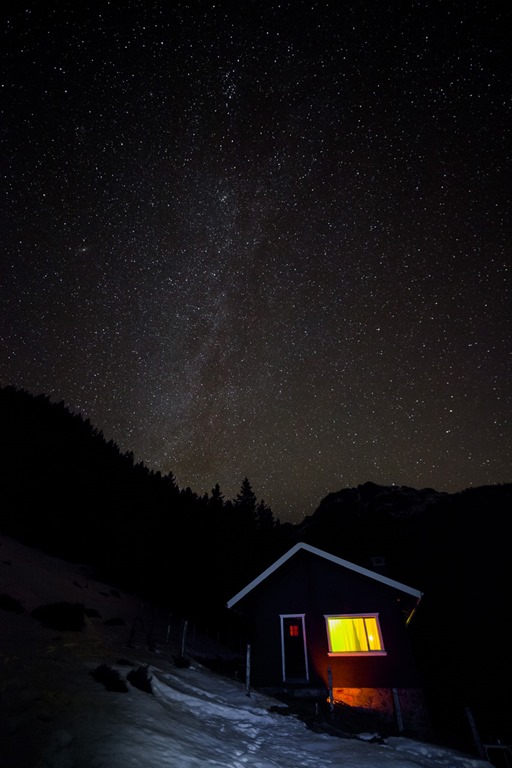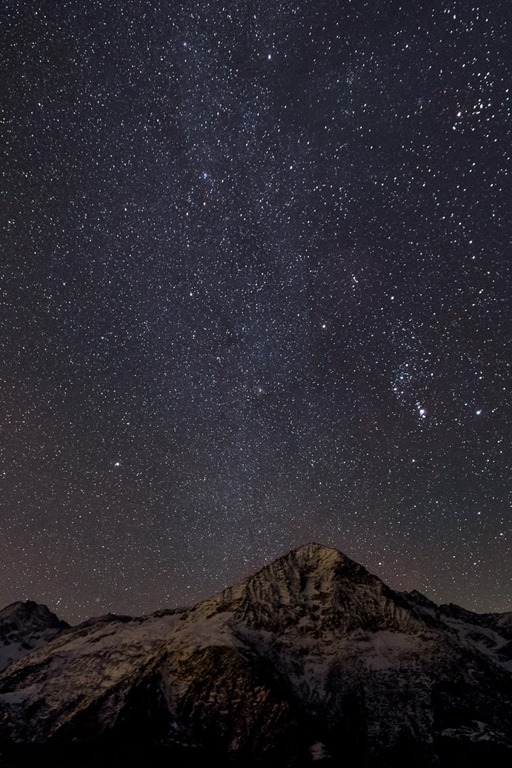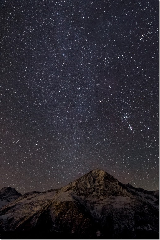 Zuerst gibt es aber noch zwei Bilder, die von einem normalen Stativ aus aufgenommen wurden: Hütte mit Milchstrasse auf der linken Seite (15mm/2.8/15s/ISO3200 mit 5DIIa) und der Bristen auf der rechten (15mm/2.8/33s/ISO3200 mit 5DIIa) .