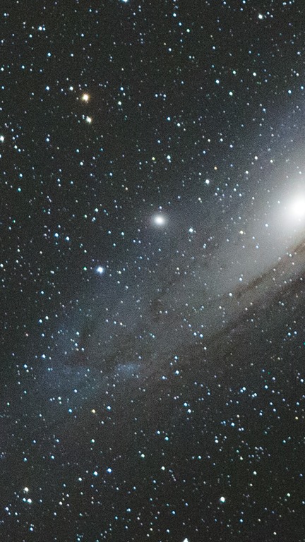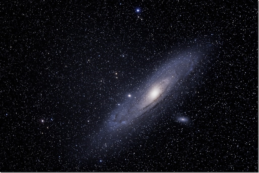 Genug der Technik, hier ist das finale Resultat: die Andromeda-Galaxie auch bekannt als M31 mit der Zwerggalaxie M110. Ich bin eigentlich sehr zufrieden damit. Es hat sicher noch Raum für Verbesserungen aber als erster Versuch kann man das Bild stehen lassen. Wenn man sich etwas schlau macht über die Andromeda-Galaxie hört man Zahlen, die schwer zu verstehen sind. Die Galaxie ist 2.5 Millionen Lichtjahre von uns entfernt. Es ist nicht etwa ein Wolke sondern sie besteht aus 1 Billion Sterne, der Durchmesser ist etwa 200000 Licht Jahre. Zum Vergleich, das Licht braucht von der Sonne zur Erde gerade einmal 8 Minuten oder bei Voyager 1, die schon seit knapp 40 Jahren unterwegs ist und auch die am weitesten entfernten Raumsonde ist, braucht das Licht gerade einmal 16 Stunden. Astronomisch betrachtet ist das alles gar nichts: Die Andromeda-Galaxie gehört wie auch unsere Milchstrasse zur “Lokalen Gruppe”, liegt also in unserer unmittelbaren Nachbarschaft …