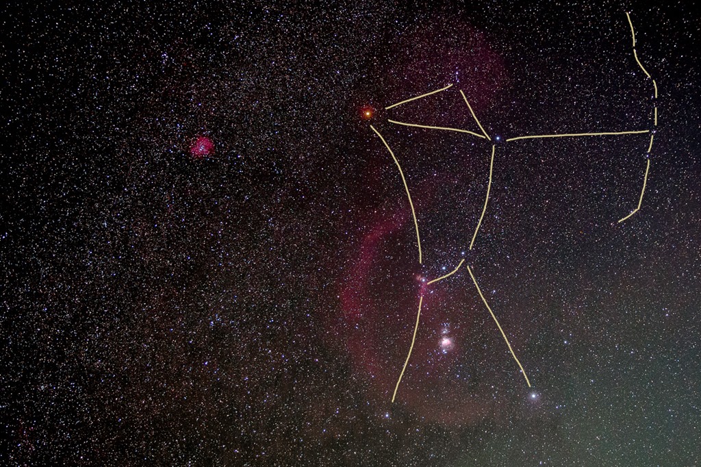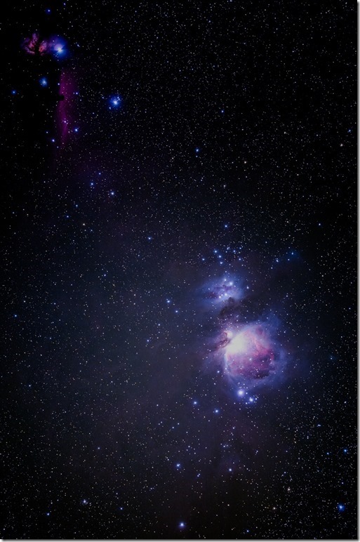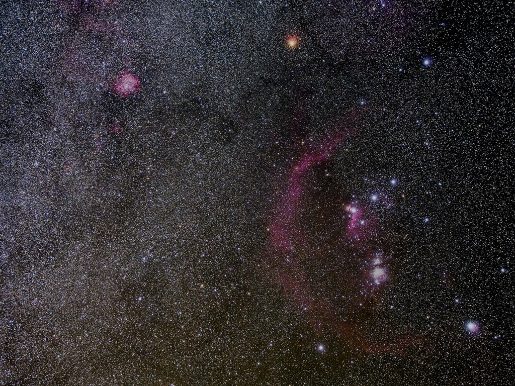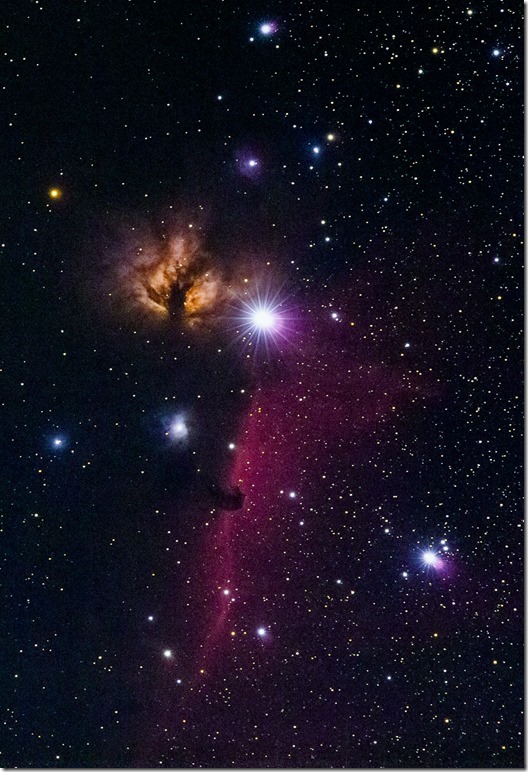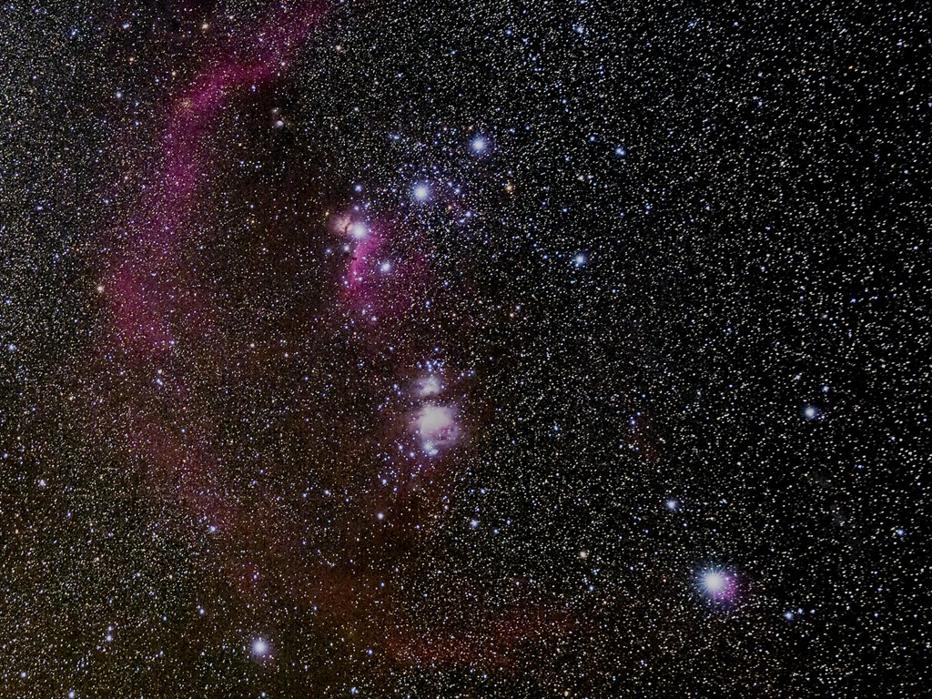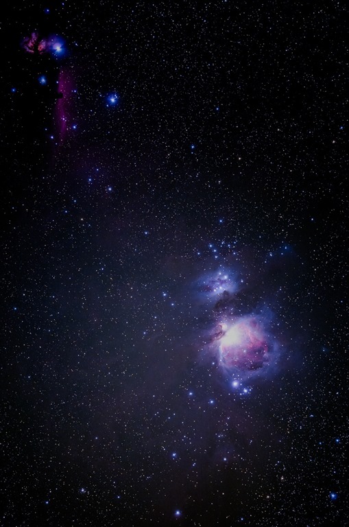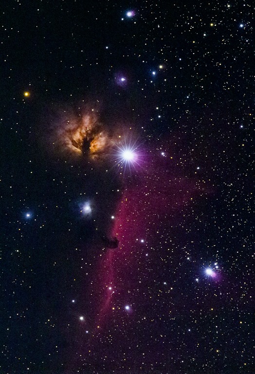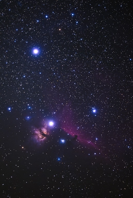 Ganz in der Nähe befindet sich auch der Orionnebel, den man auch mit dem blossen Auge als eine diffuse Region im Sternbild Orion erkennen kann. Das Bild auf der rechten Seite zeigt sowohl den Pferdekopf, also auch den Orionnebel.