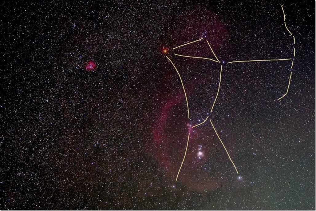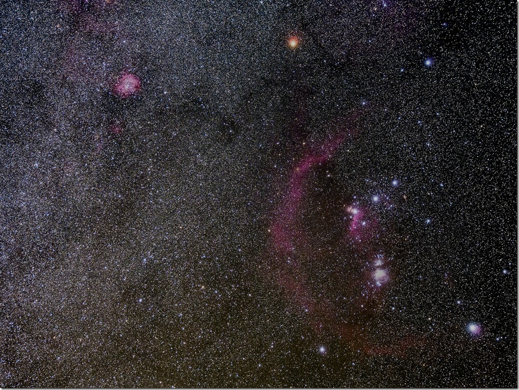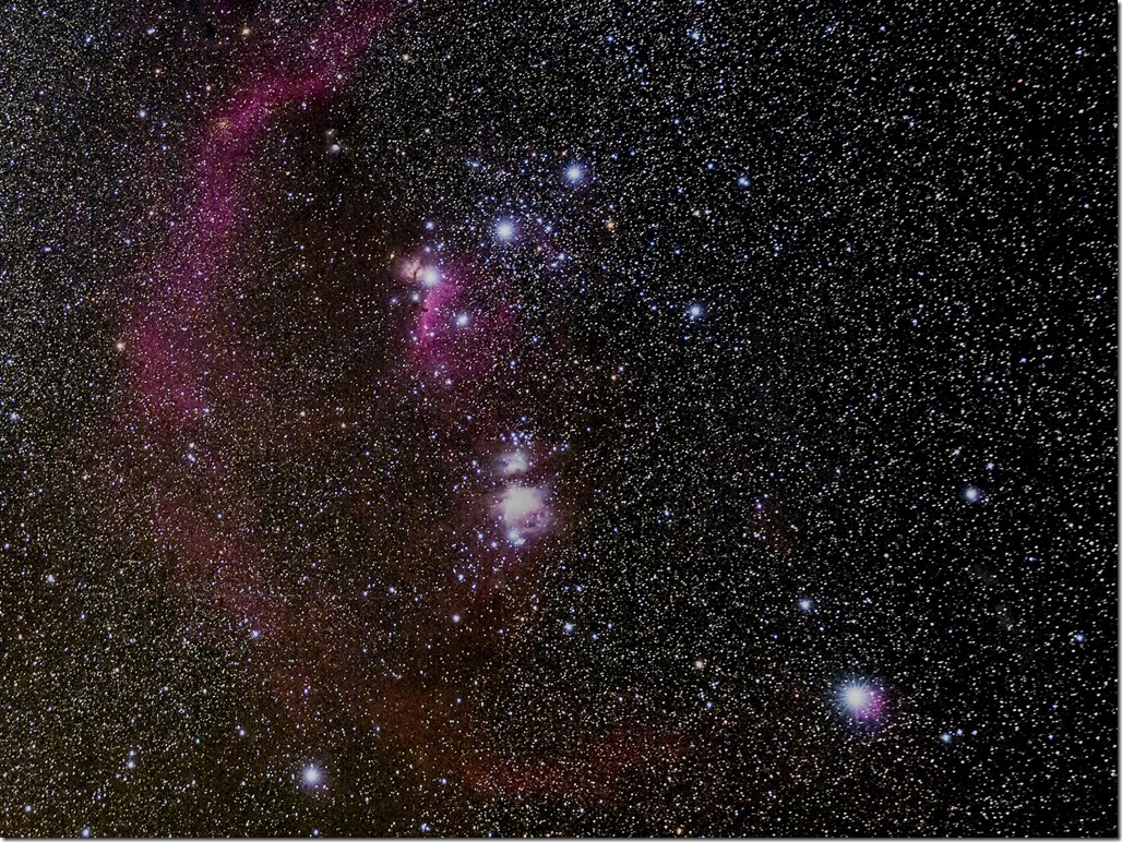 Zu guter letzte habe ich mich noch an einem Übersichtsbild um das Sternbild Orion versucht. Was viele nicht wissen ist die Tatsache, dass es im Sternbild Orion noch eine ganze Zahl von schwächeren Objekten gibt. Ein Versuch, diese aufzunehmen, zeigt zwar schon einige Details, scheitert aber schlussendlich am unserem alten Bekannten, dem Mond. 14 Tage warten, dann geht es weiter. Stay tuned … !