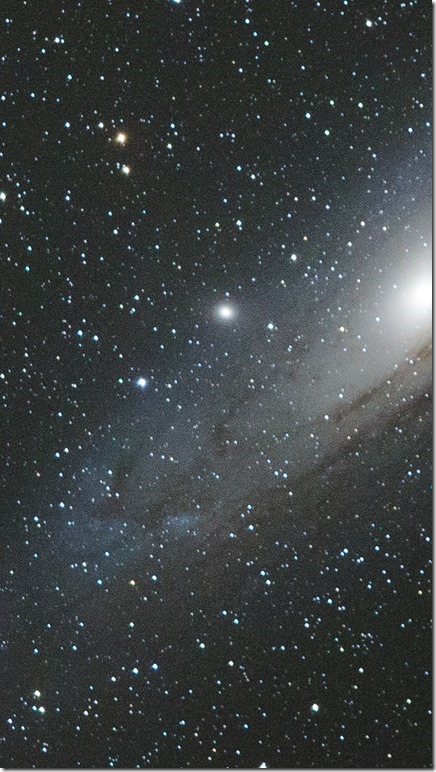 Zuerst habe ich mir die einfach zu findende Andromeda-Galaxie vorgeknüpft. Dank der Nachführung kann ich mit dem 300mm Objektiv sogar 60 Sekunden belichten und bekomme immer noch ganz runde Sterne. Um das Signal-zu-Rausch Verhältnis zu verbessern werden heute die Astro-Bilder eigentlich immer “gestackt”, d.h. man nimmt das gleiche Objekt viele Male auf und legt dann alle Bilder übereinander. Dadurch mittelt sich das Rauschen aus und man bekommt ein deutlich besseres Resultat im Vergleiche zum Einzelbild. Ausserdem werden Bilder mit den gleiche Einstellung aber bei geschlossenem Objektiv aufgenommen und in die Berechnungen einbezogen. Dadurch wird das systembedingte Rauschen des Kamera-Sensors berücksichtigt. Die beiden folgenden Bilder zeigen schön, was das bringt. Auf der rechten Seite ist ein Ausschnitt der Andromeda-Galaxie von einem Originalbild zu sehen (300mm/2.8/60s/ISO1600 mit Canon 5DIIa). Rechts der gleiche Ausschnitt des fertigen Bildes. Es ist aus 20 Light Frames (belichtete Bilder), 10 Dark Frames (dunkel belichtete Bilder) und 10 Bias Frames (Kamera Auslese-Rauschen) entstanden. Dass die beiden Bilder leicht anders kalibriert sind ist hier irrelevant. Es geht und die Bilddetails, die deutlich besser auf der rechten Seite sind. Da man die Darkframes bei gleichem Kamera-Setup, speziell auch bei gleicher Temperatur, machen muss, dauert eine solche Aufnahme doch etwas an Zeit: 20 x 1 Minute + 10 x 1 Minute = 30 Minuten.