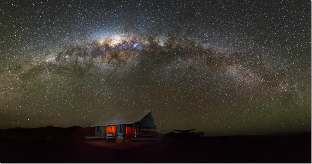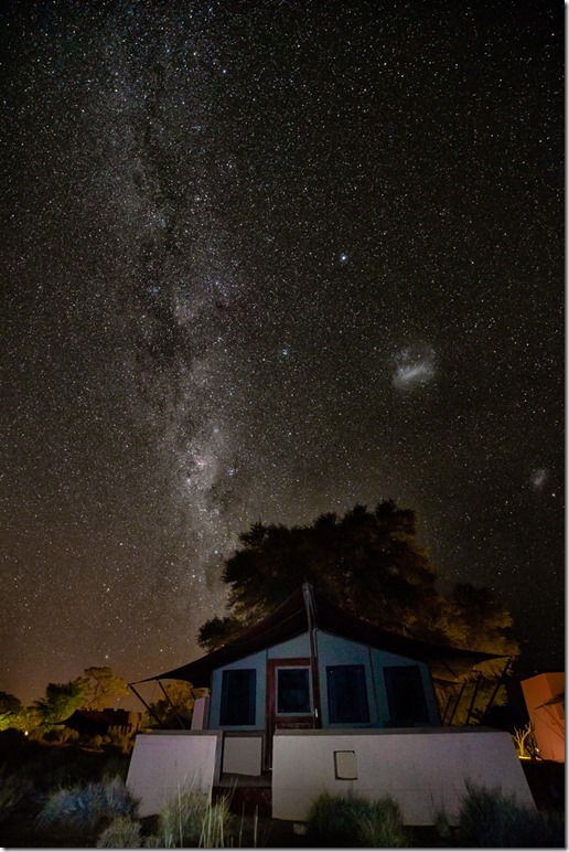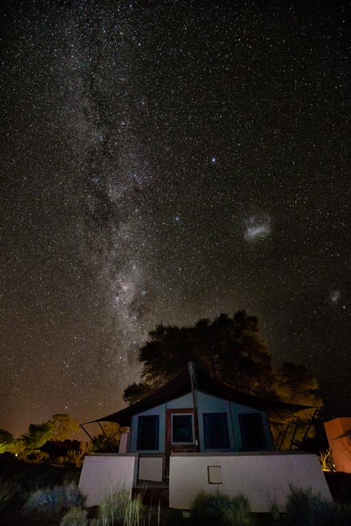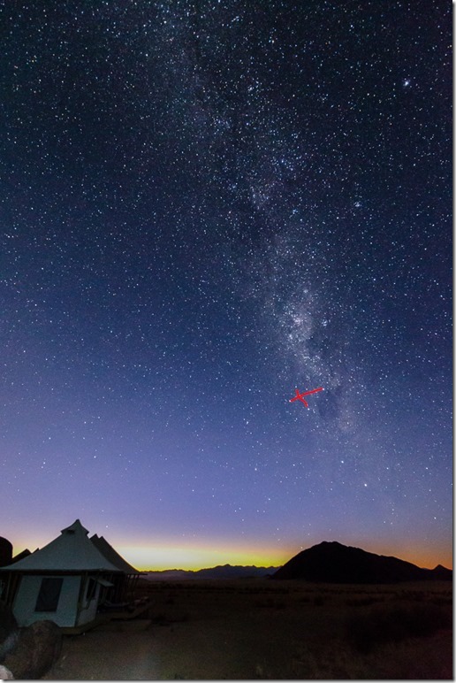 Mindestens sieht man auf dem folgenden Bild links die zwei Magellanschen Wolken. Das dass ein ungewohntes Bild ist liegt daran, dass die zwei Wolken von der Schweiz aus nicht beobachtbar sind. Es sind übrigens nicht “Wolken” sondern zwei Mini-Galaxien in nur rund 200000 Lichtjahren Entfernung, also in unserer Nachbarschaft astronomisch betrachtet. Auf der rechten Seite sieht dämmert es schon über dem Boulder Camp in Wolwedans. Ich habe das Sternbild “Kreuz des Südens” eingezeichnet. Es zeigt in die Richtung des Südlichen Pols, gleich wie der Grosse Wagen. Australien und Neuseeland haben dieses Sternbild übrigens in ihrem Wappen.