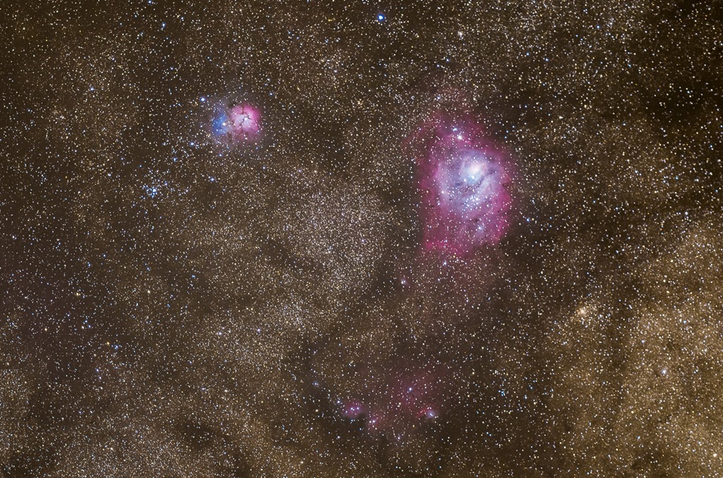 Jetzt war die Zeit da, den Barn-Door Tracker wirklich zu testen. Der entscheidende Punkt bei dieser Apparatur ist, dass man die Rotationsachse parallel zur Erdachse ausrichtet. Dann kann man mir nur einer Schwenkbewegung die Rotation der Erde ausgleichen. Das ganze lässt sich natürlich nicht so genau wie ein richtiges Teleskop-Mount ausrichten. Und man kann auch nicht einen möglichen Fehler im laufenden Betrieb korrigieren. Aber es ermöglicht deutlich längere Belichtungszeiten, ohne dass die Sterne zu Streifen werden. Das folgende Bild Zeit das sehr eindrücklich.  Es zeigt den Trifid Nebel auf der linken Seite und den viel grösseren Lagoon Nebel rechts. Das Bild wurde mit einem 300mm Objektiv bei Blende 2.8  für 35 Sekunden belichtet. ISO war auf 1250 eingestellt.  Ohne Nachführung wäre gemäss der 500er Regel bei dieser Brennweite eigentlich nur ein Belichtungszeit von 1.5 Sekunden möglich. Cool, nicht?