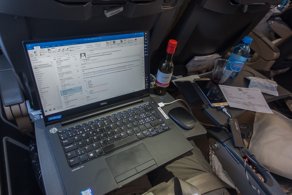 Home-Office ist eingerichtet und betriebsbereit! Home-Office? Jaja, nicht ganz Home, aber 97% Office. Und zum Glück ist der Flieger nicht einmal halb voll. So bekommt man leicht einen “Softupgrade” des Sitzplatzes.