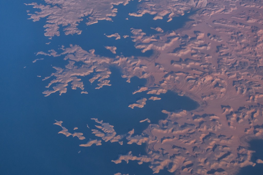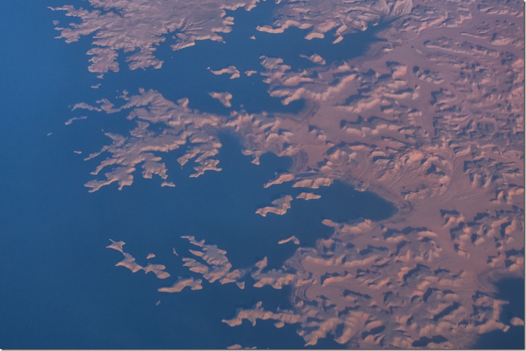 Das folgende Bild zeigt einen Teil des Nassersees bei Abu Simbel. Aus 12km Höhe durch die Scheibe fotografiert sieht es leider nicht so spektakulär aus.