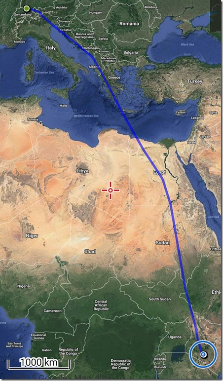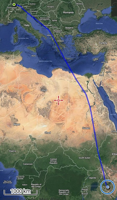 Der Weg des Flugs. Es es in etwa die gleiche Strecke, die wir auf dem Mittelholzer Reise im 2014 geflogen sind. Nur waren wir da drei Stockwerke tiefer.
