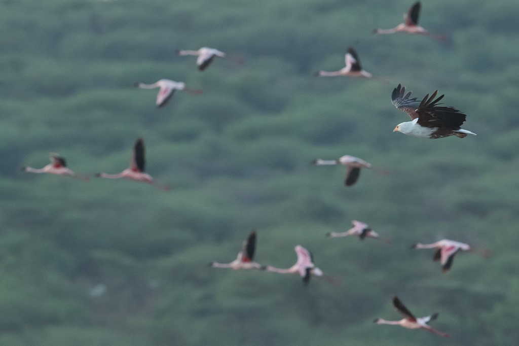 Wenig später fliegt er wieder davon, umringt von zahlreichen Flamingos, die aber alle einen Sicherheitsabstand einhalten.