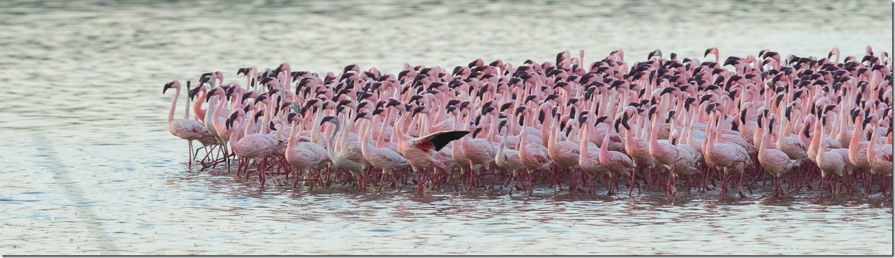 Gestern war der Sonnenaufgang relativ schwierig einzufangen, da die Flamingos an der “falschen” Stelle gegen die Sonne standen und zudem der Boden dort so weich war, dass man nicht mit dem Fahrzeug hinfahren konnte. Versuche, diese Distanz zu Fuss zu verkürzen, endeten damit, dass sich die Flamingos noch weiter vom Ufer entfernten, da sie offensichtlich sehr ängstlich sind. Und ausserdem verwandelten sich die Schuhe in kurzester Zeit in schwere Lehmklumpen. Heute ist das ganz anders. Die Flamingos sind schön brav und stehen in grosser Zahl am einen Ende des Sees, sodass wir unser Fahrzeug ideal platzieren können. Abermals wird eine Abschätzung der Anzahl gemacht: 50m x 120m = 6000m2 x 5 ~ 30000 Flamingos.