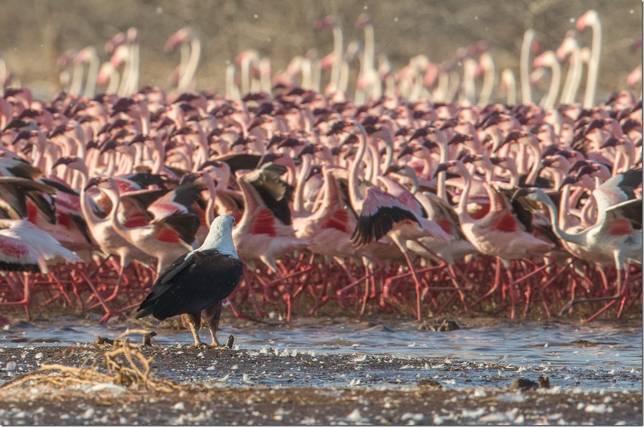 Plötzlich gibt es eine riesige Aufruhr. Wasser spritzt, überall flattert es. Und der Geräuschpegel ist nochmals deutlich höher. Als sich die Lage etwas beruhigt, wird ersichtlich, was der Grund dafür ist. Ein Fischadler hat sich zu den Flamingos gesetzt. Dass diese beiden Spezies nicht freundlich zueinander gesinnt sind, ist offensichtlich. Es ist aber nicht klar, ob Fischadler die Flamingos auf dem Speiseplan haben. Diesem Fischadler scheint es zu gefallen, dass er der Chef auf dem Platz ist.