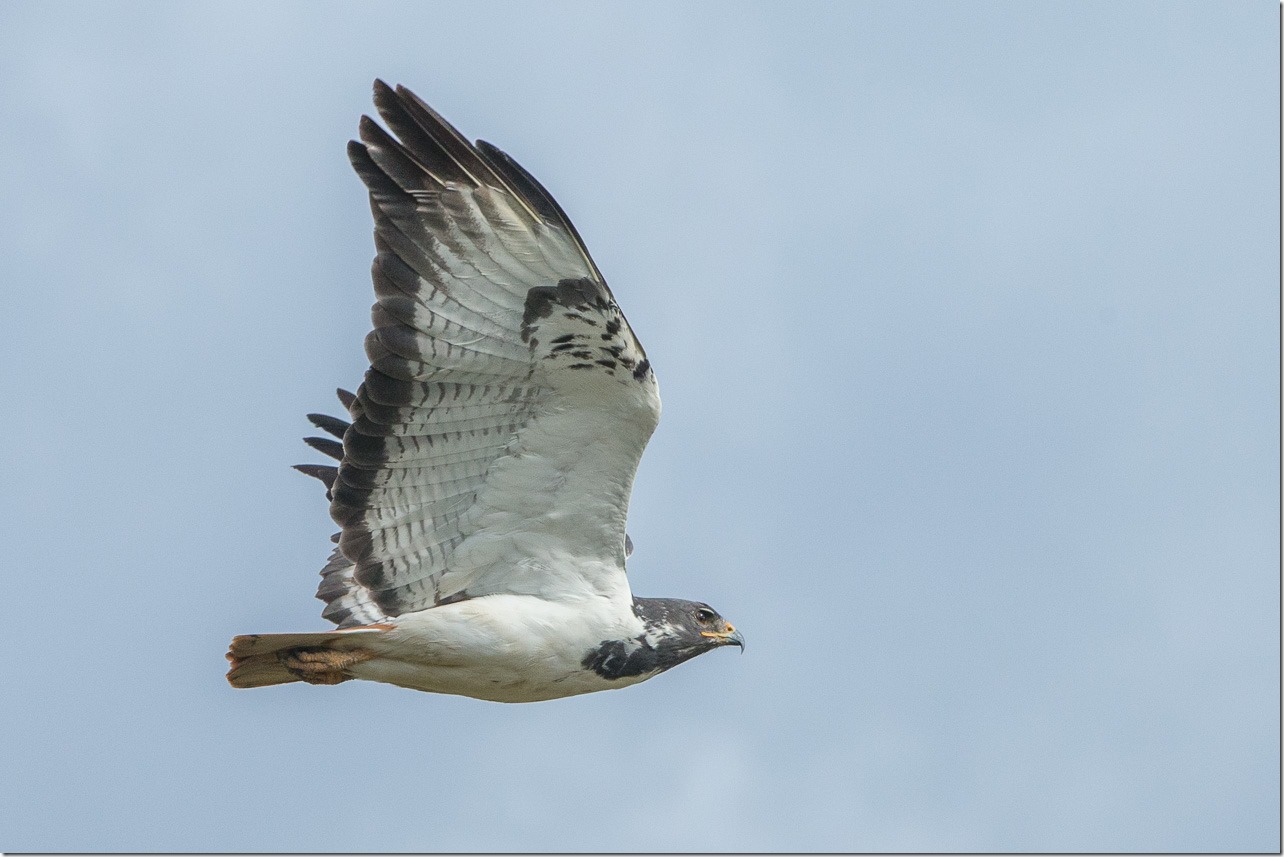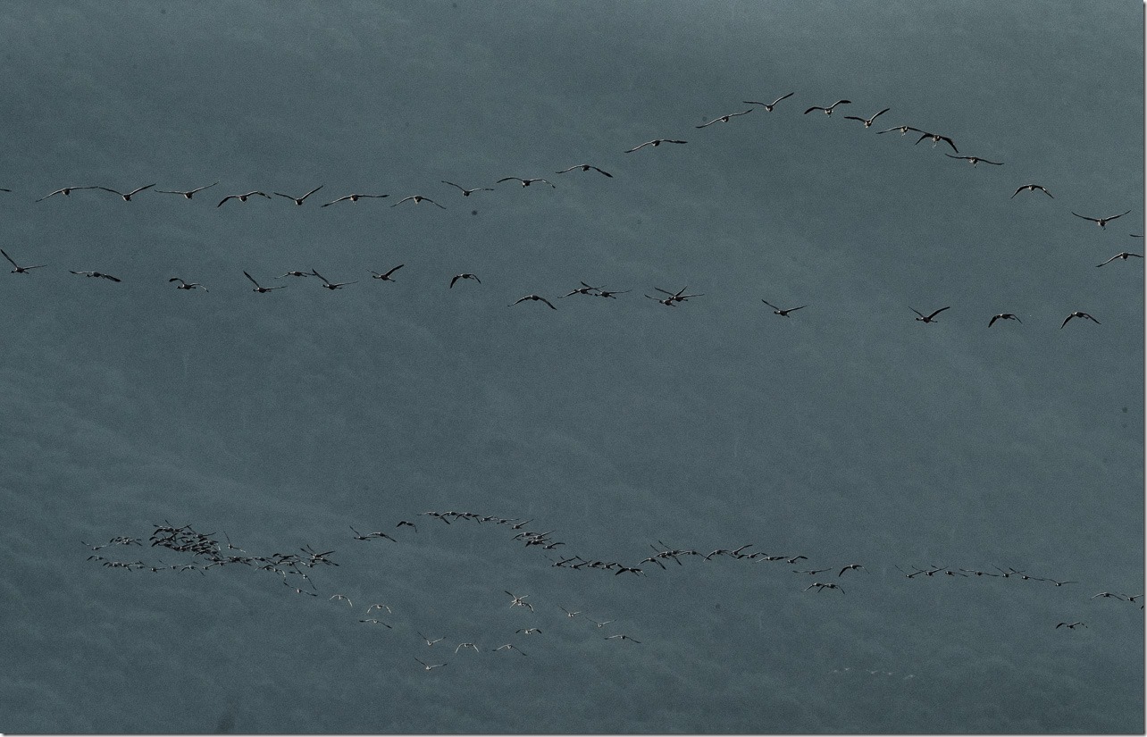 Die Flamingos bilden im Flug fast immer eine Kette. Ich habe mit mässigem Erfolg versucht, das auf dem folgenden Bild einzufangen. In einem Video sieht es viel spektakulärer aus. Denn die “Ketten” scheinen an Ort zu verharren, obwohl sich die Flamingos im Flug ja fortbewegen. Wenn zum Beispiel eine Welle geflogen wird, wie im Bild unten, dann verharrt der Buckel am gleichen Ort. Sieht wirklich erstaunlich aus.