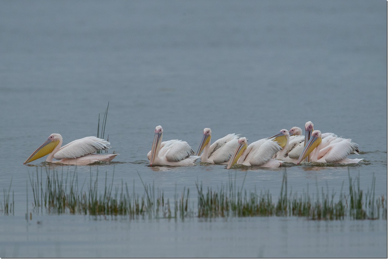 Pelikane beim Abendspaziergang. In dieser Gruppe tauchen sie, wie auf ein unsichtbares Kommando folgend, simultan ihre Schnäbel ins Wasser um kleine Fische (?) zu fangen.