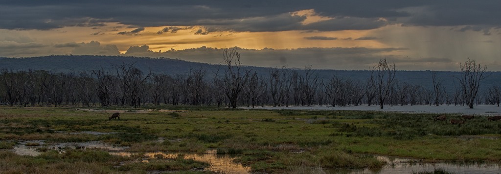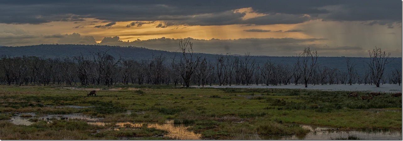 Stimmung bei Sonnenuntergang. Auch beim Lake Nakuru ist in den letzten Jahren der Wasserspiegel stark gestiegen. Die ursprüngliche Uferstrasse ist nicht mehr befahrbar. Und die ufernahen Bäume sind alle abgestorben, da auch dieser See stark alkalisch ist. Wir befinden uns hier übrigens im “Great Rift Valley”, ein Tal das sich über 6000 Kilometer vom Libanon bis hin nach Mozambique erstreckt.