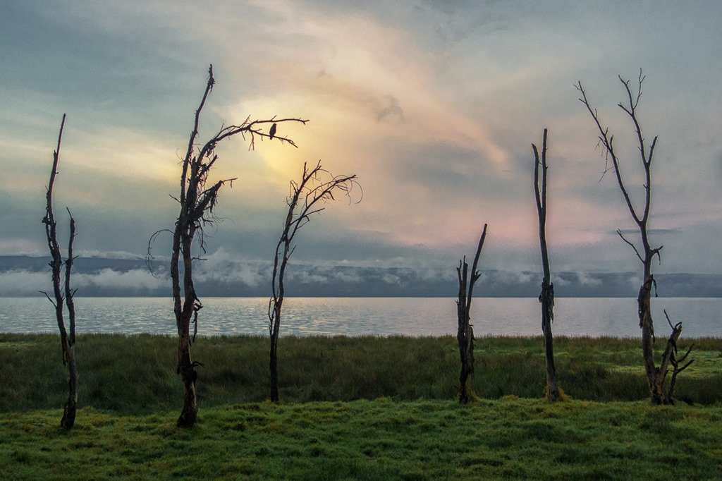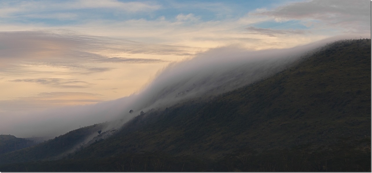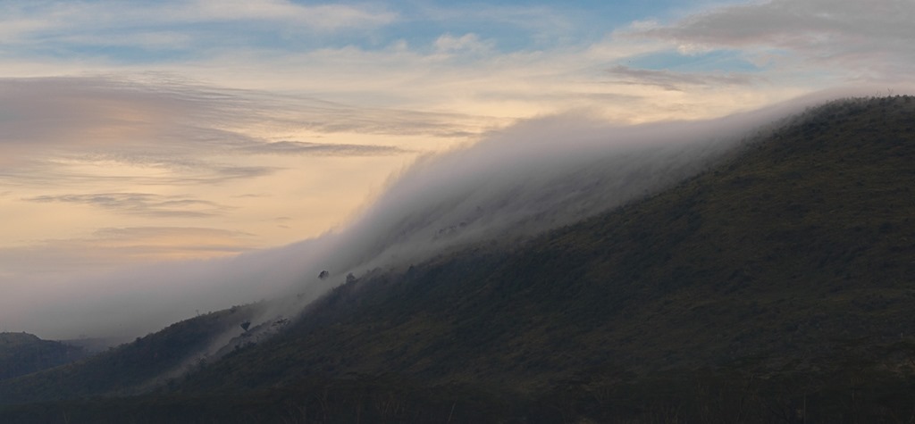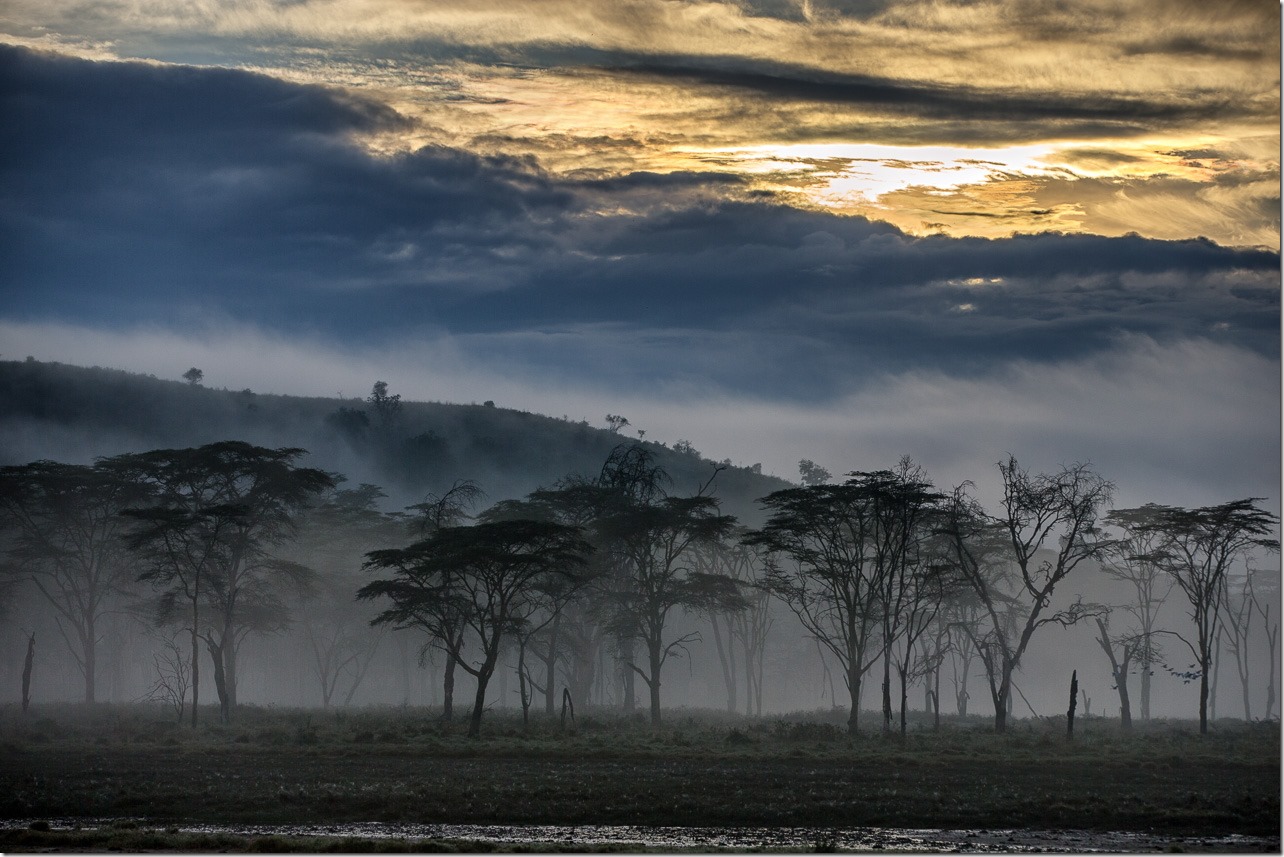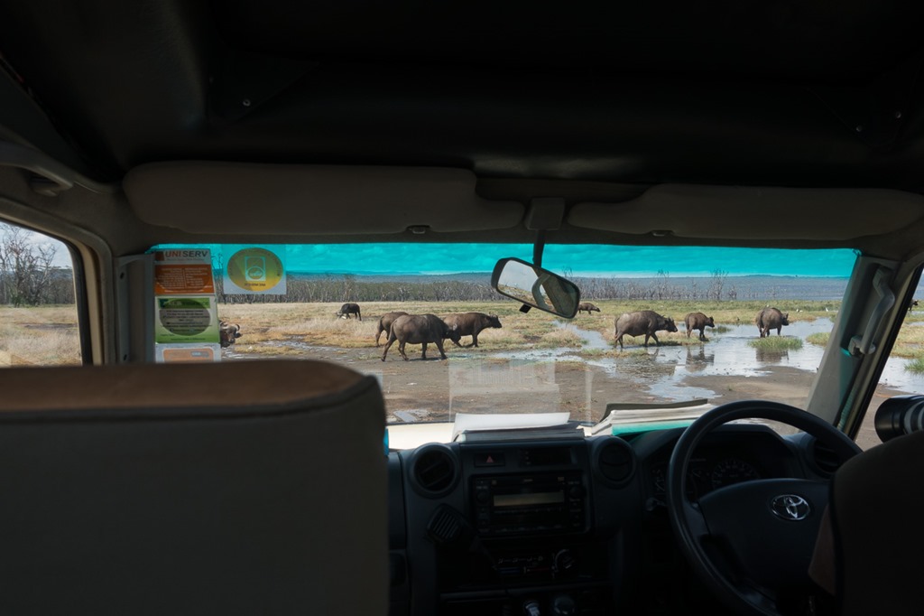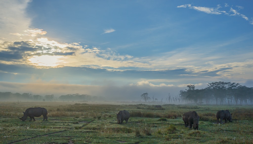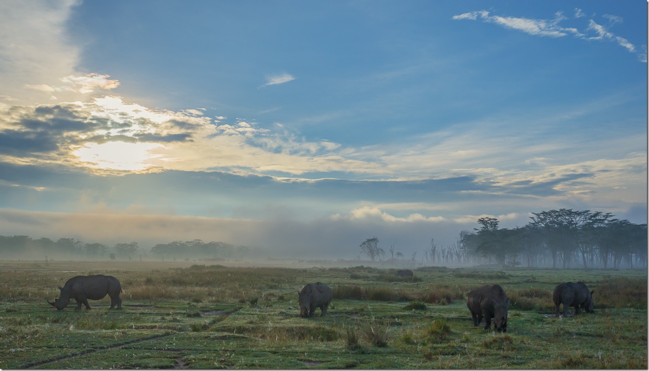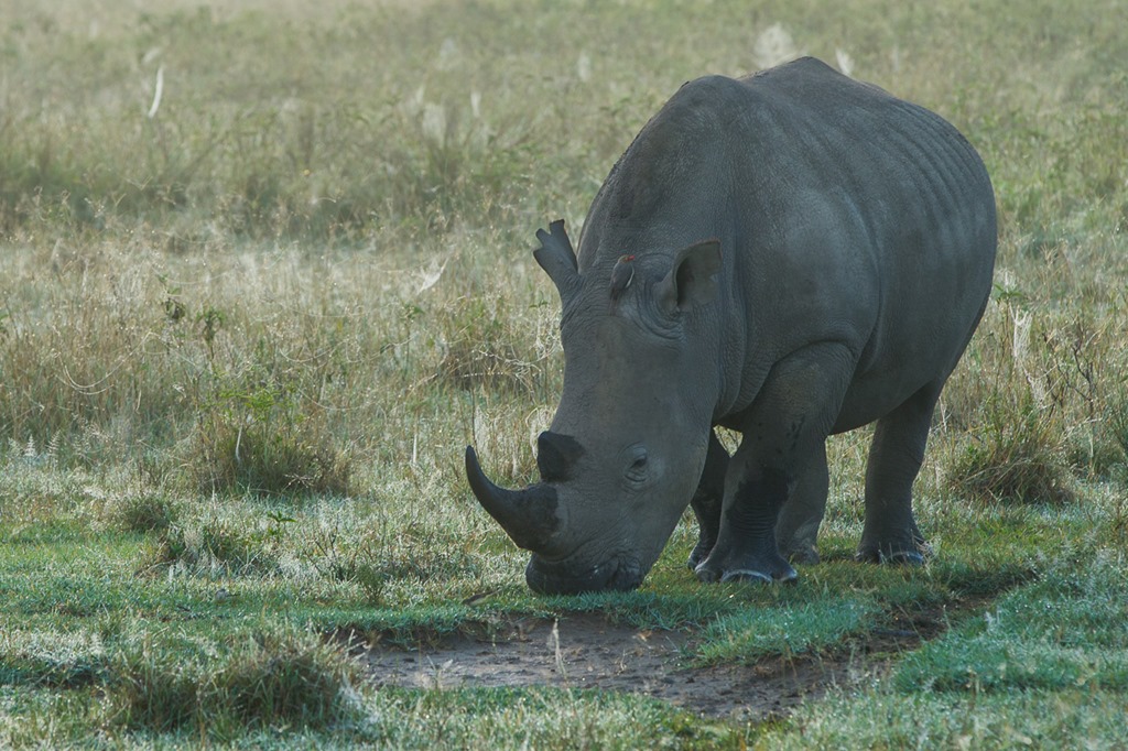 Während wir noch die Landschaft bestaunen, stelle ich plötzlich fest, dass sich die im Nebel nur schemenhaft erkennbare Herde von Büffeln plötzlich in Nashörner verwandelt hat. Nicht nur eines, gleich fünf treten aus dem hohen Grass hervor. Die Wilderei von Nashörnern hat in Kenia glücklicherweise (noch) nicht das Ausmass von Südafrika erreicht. Trotzdem hat es auch hier zwei bewaffnete Jäger, die 24 Stunden am Tag zu Fuss den Tieren folgen.