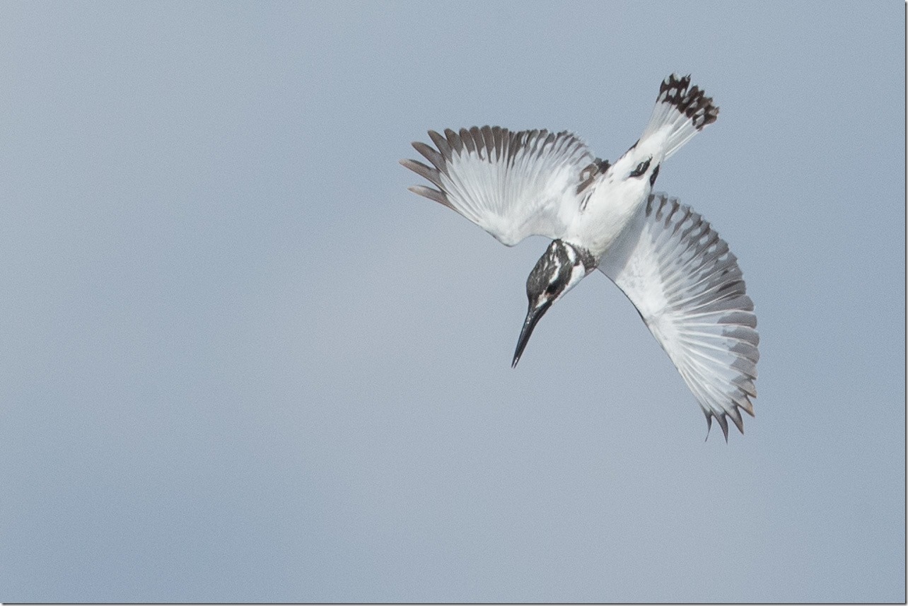 Der “Pied Kingfisher” ist dafür bekannt, dass er über dem Wasser flatternd schwebt und sich dann im Sturzflug auf einen Fisch stürzt. Die Erfolgsrate ist aber bescheiden, sodass ich viele Möglichkeiten habe, den Sturzflug festzuhalten. Und die brauche ich auch, bis ein vernünftiges Resultat feststeht.