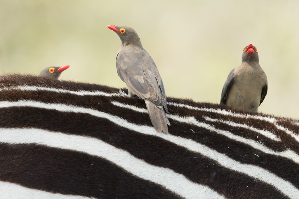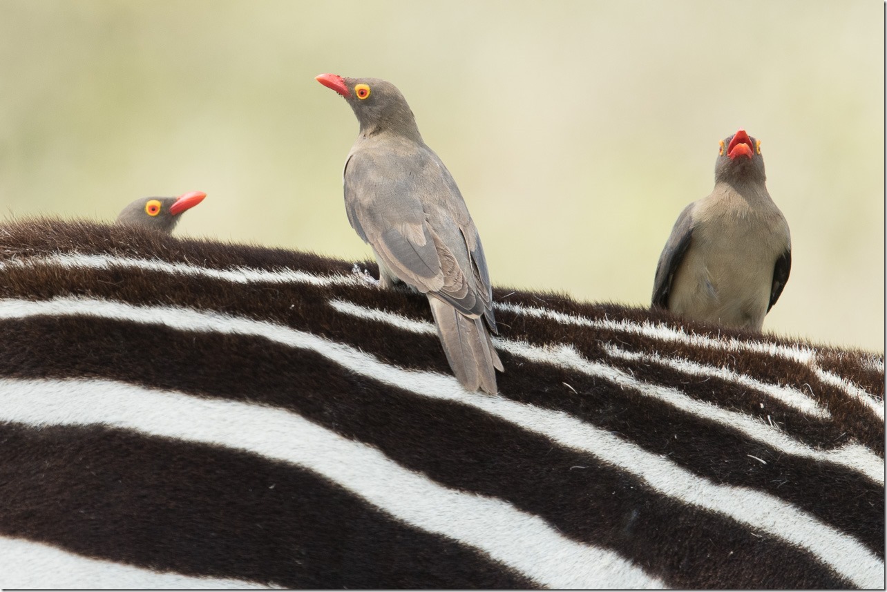 Am Nachmittag gibt es eine weitere Ausfahrt, wir wählen einen anderen Weg und fahren ins Landesinneren. Abermals sieht man auf dem folgenden Bild Oxpecker, sie haben sich aber wieder einmal nicht auf einem Ox sondern einem Zebra niedergelassen.