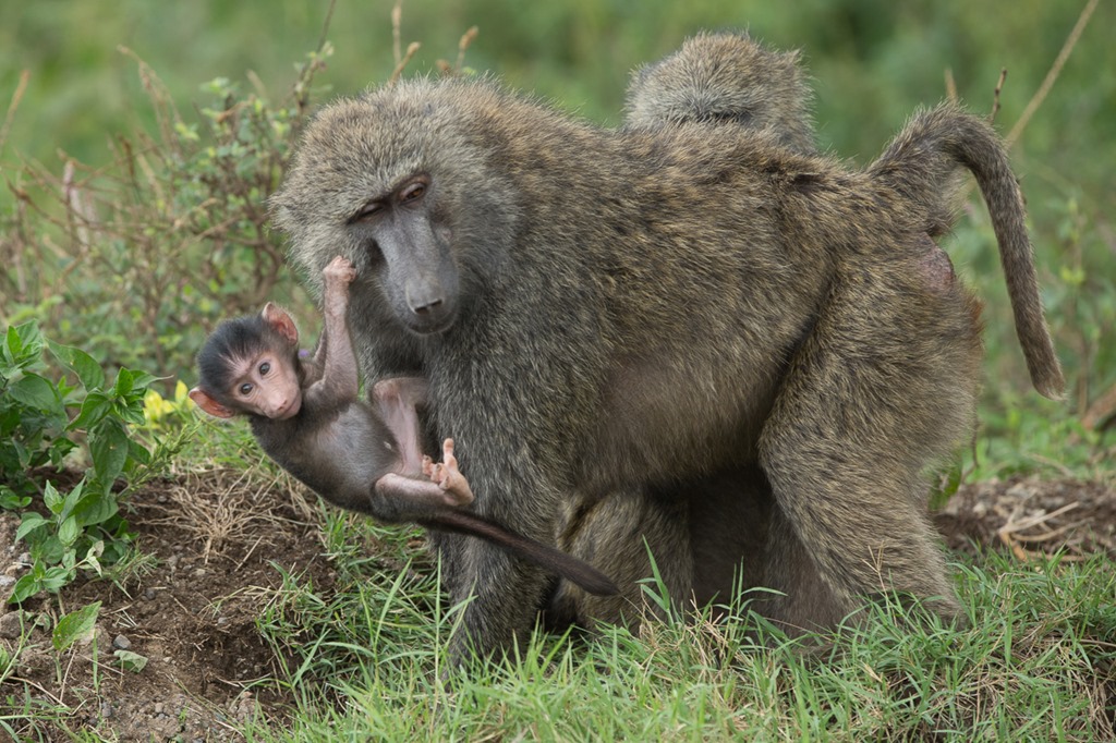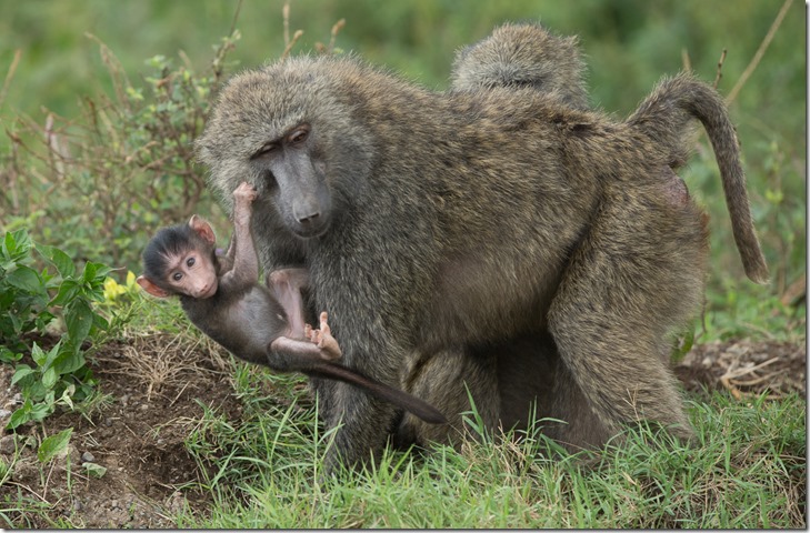 Den Abschluss bildet eine Gruppe Baboons, die sich auf dem Weg niedergelassen haben und erst Platz machen, nachdem wir gefährlich nahe herangerollt sind.