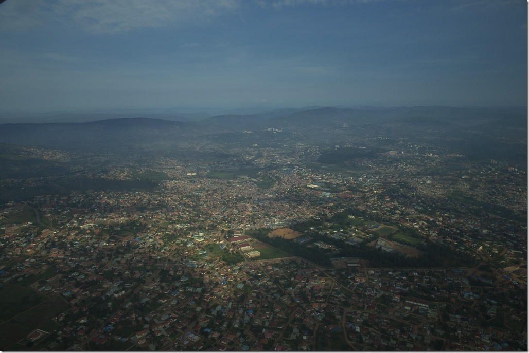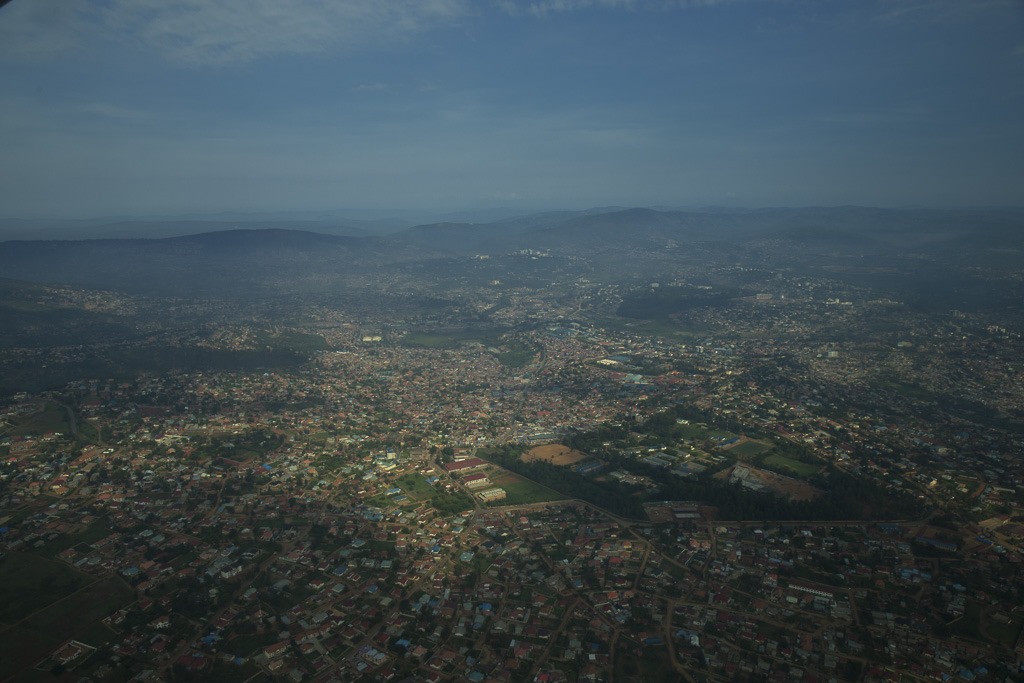 Kurz nach dem Start, der Blick zurück nach Kigali. Das Stadtzentrum befindet sich in der Bildmitte vor der Bergkette. Man knapp einige Hochhäuser erkennen.