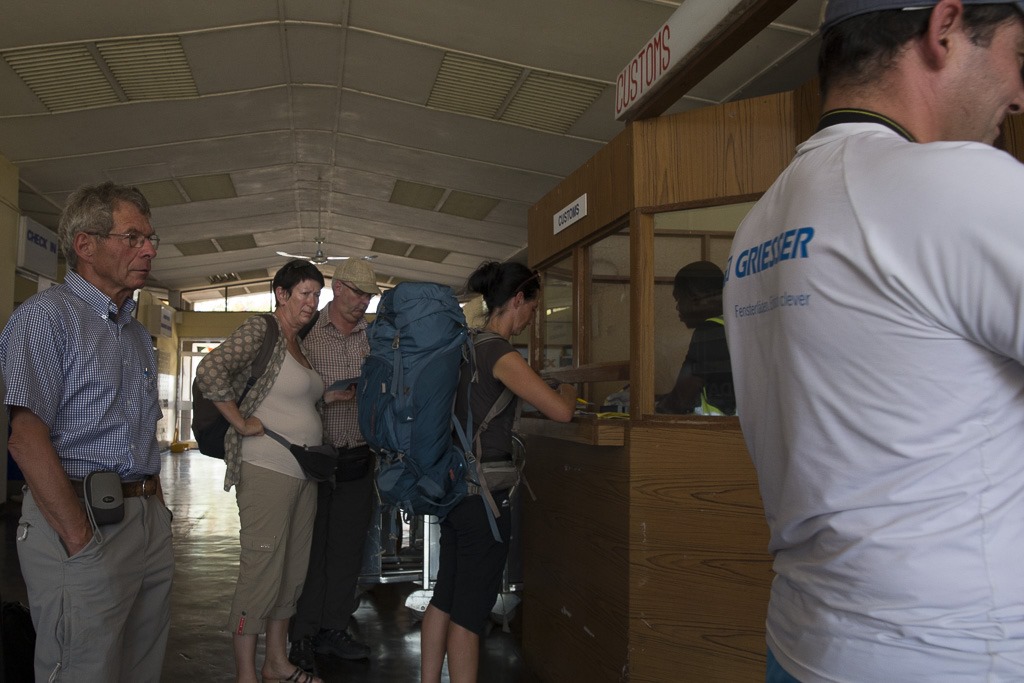 Obwohl wir von drei Personen bei den Einreisevormalitäten (Gesundheitsfragen, Fieber messen, Zettel ausfüllen, Visum bezahlen, Visum ausfüllen, Visum einkleben, Personen Daten nochmals erfassen, etc…)  bedient werden, dauerst es eine gefühlte Ewigkeit bis alles durch ist. Das macht aber nichts, ist doch Georg immer noch an seinem Dauerlauf zwischen den verschiedenen Instanzen im Flughafen.