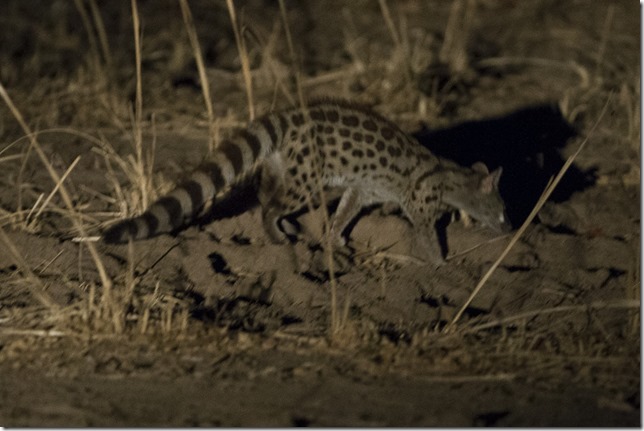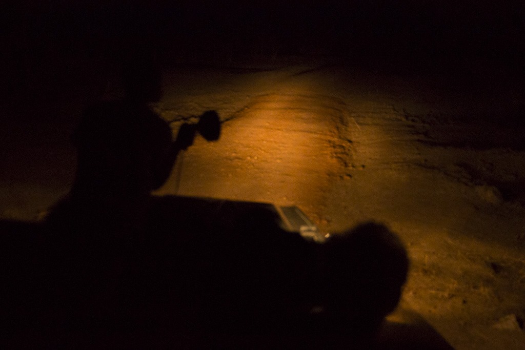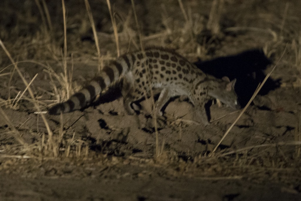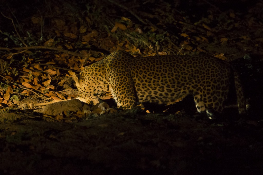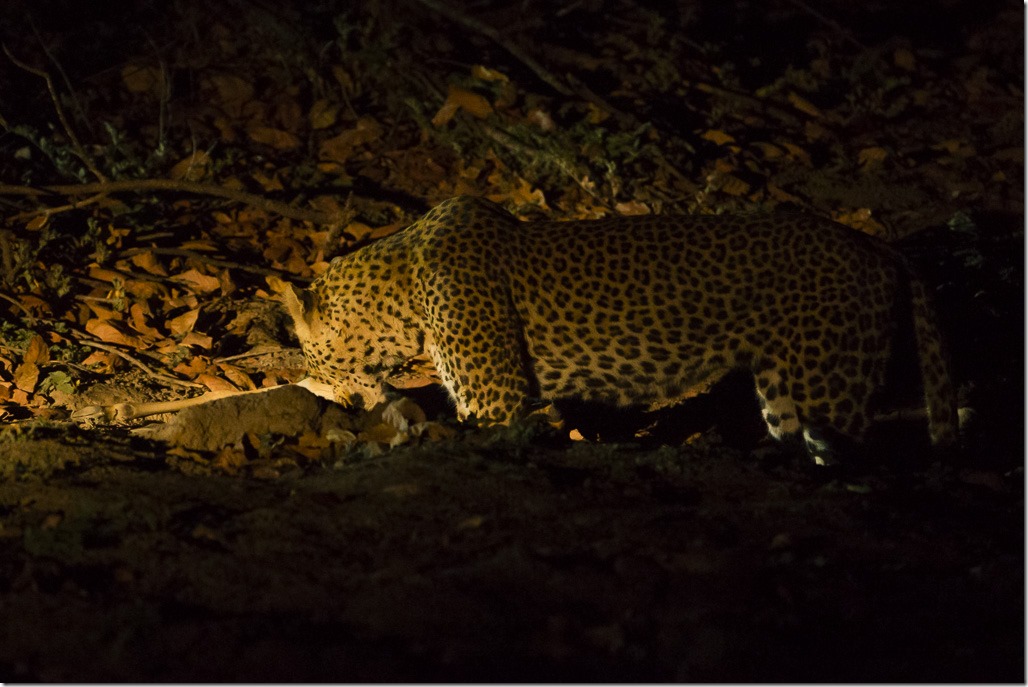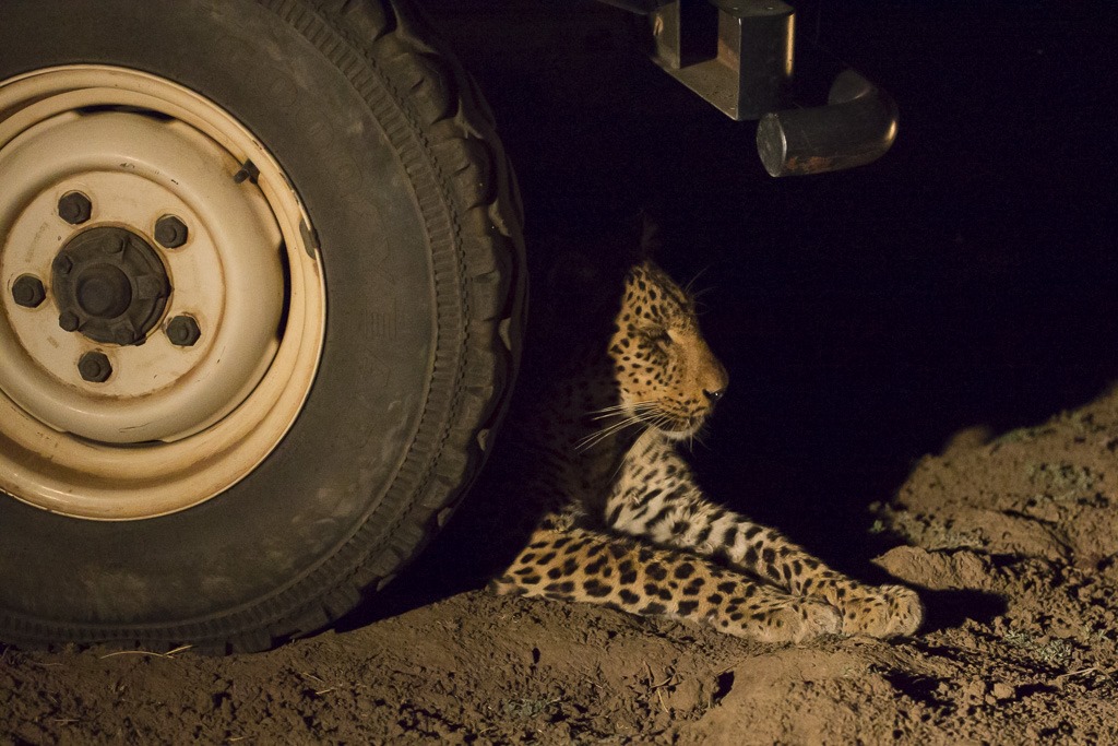 Irgendwann erreichen wir eine Stelle, an der bereits zwei andere Safari-Fahrzeuge parkiert sind. Ich sehe kurz im Flackern eines Lichts, dass sich etwas unter einem der beiden Fahrzeuge befindet. Was es ist, ist aber nicht auszumachen. Erst nach einiger Zeit fällt genügend Licht auf die Stelle, sodass wir das Tier genau erkennen können: ES IST EIN LEOPARD!