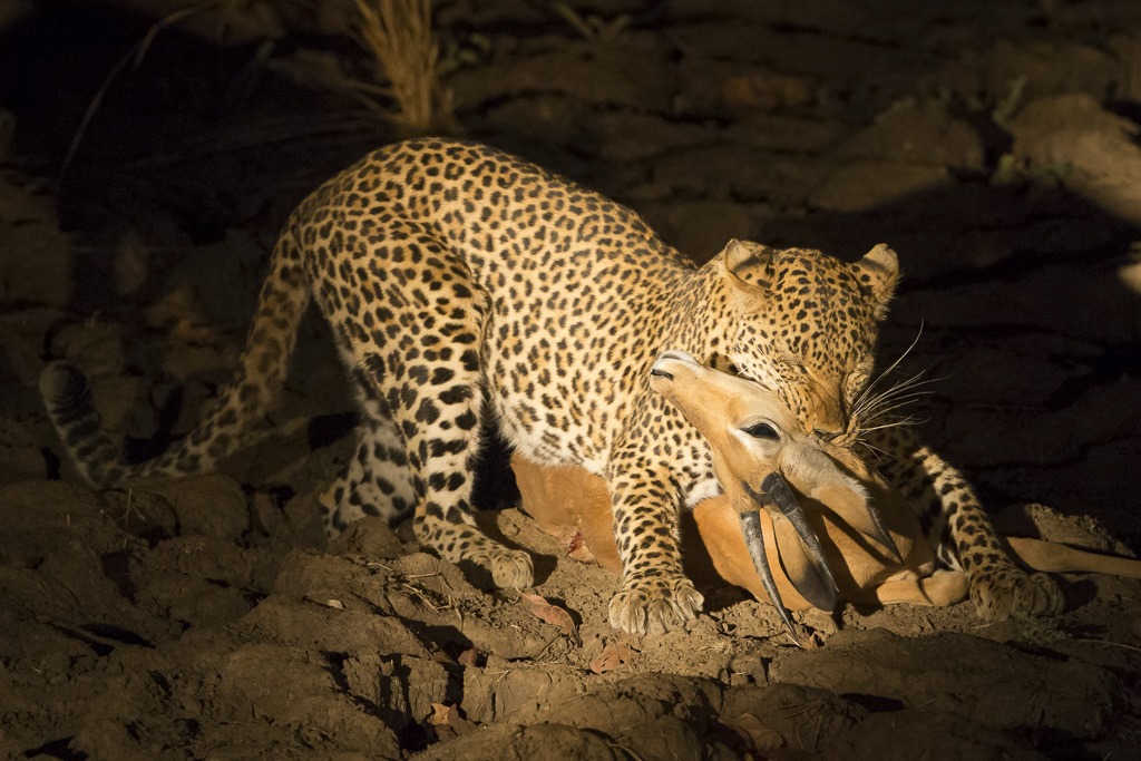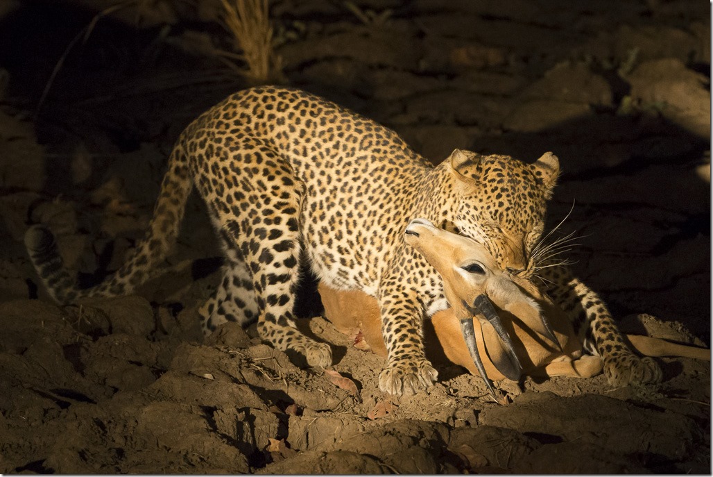 Leoparden erwürgen die Beute. So verharrt er sehr lange in dieser Position, lockert manchmal den Würgegriff, um zu sehen, ob das Tier schon tot ist.