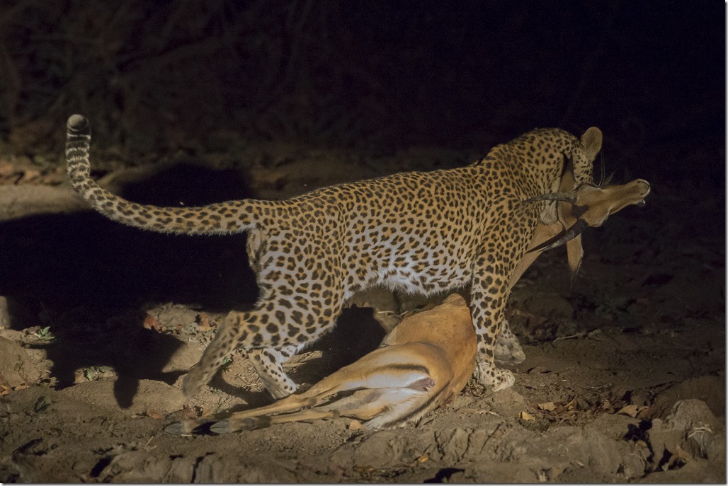 Sofort beginnt er das Tier wegzuziehen. Leoparden können Beute bis 80 kg auf einen Baum schleppen, wo es vor anderen Raubtieren sicher ist.