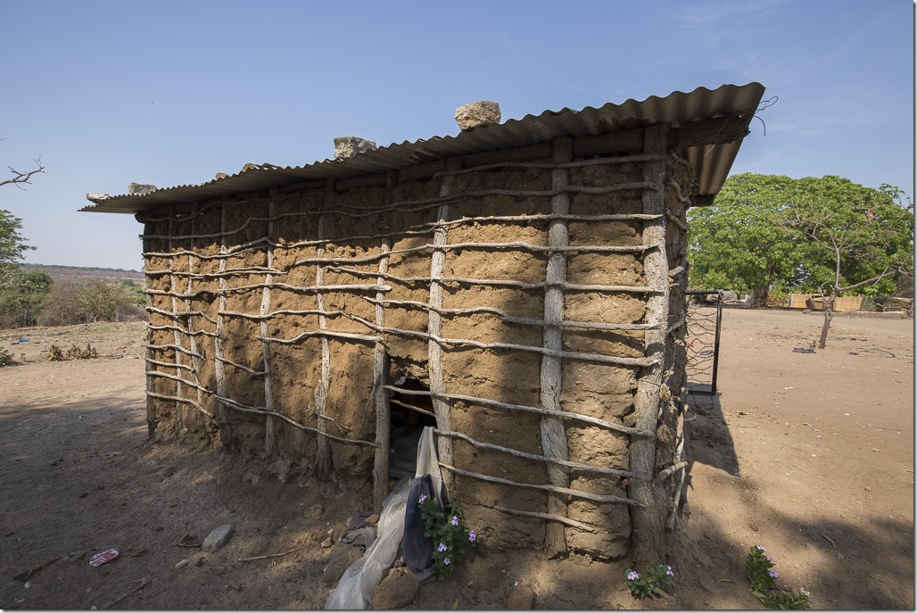 Dies ist die typische Bauart eines Hauses. Eigentlich sollte das Dach aus Stroh sein. Da es in dieser Region aber davon zu wenig gibt, hat man sich mit einem Blech ausgeholfen. Beim Bau gibt es eine klare Arbeitstrennen. Der Mann ist zuständig für das Holzpfähle, während die Frau sich um das Verputzen kümmert.