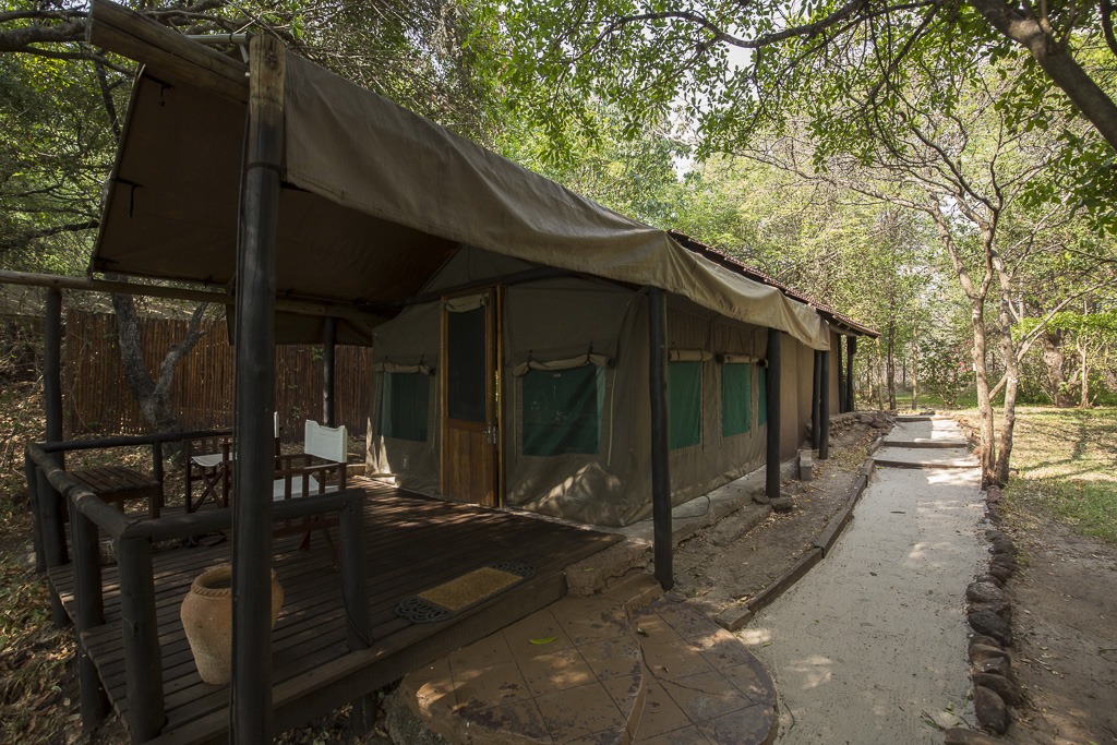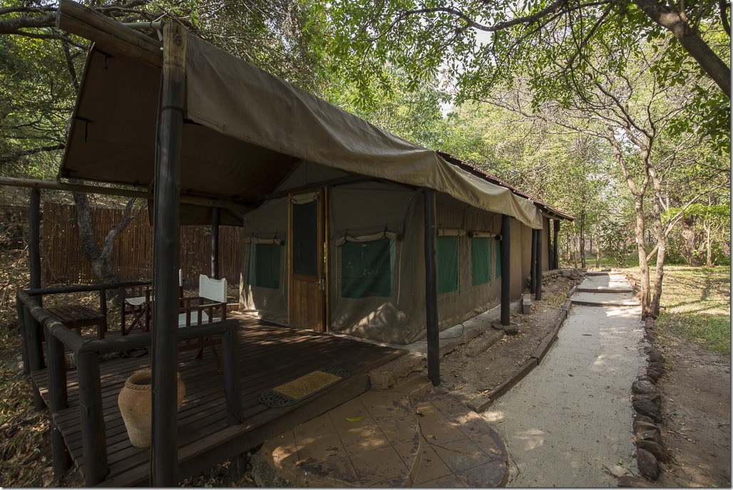 Eines unserer Zelte. Der hintere Teil, das Bad, ist gemauert, der fordere Teil ein Zelt mit Holzboden.