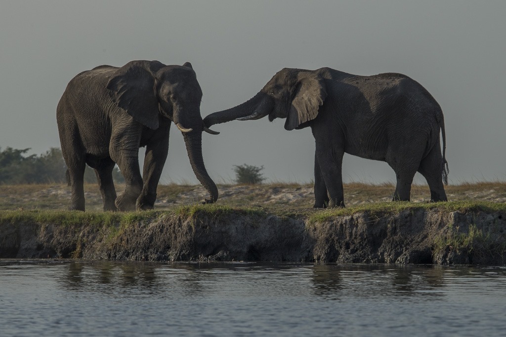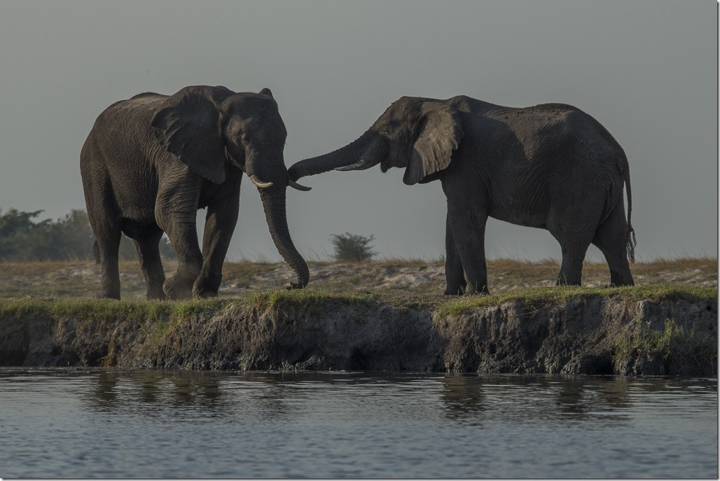 Auf heute stossen wir wieder auf Elefanten. Sie haben heute aber offensichtlich den Fluss überquert und tummeln sich nun auf einer (grösseren) Insel in der Mitte des Flusses.