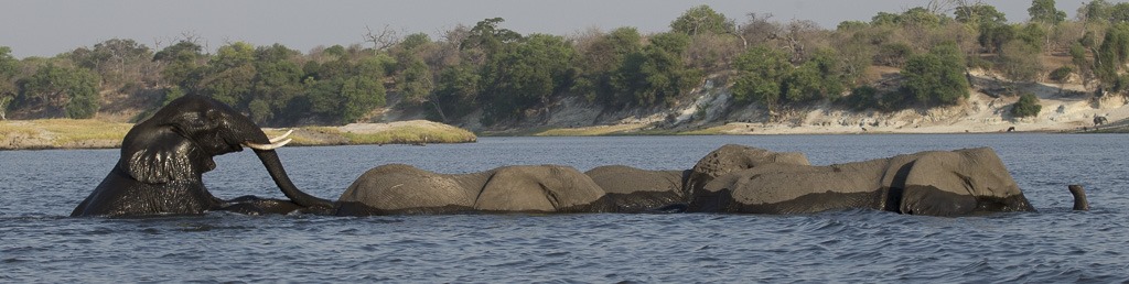 Schlussendlich setzt sich die Meinung der Durchquerung durch. Wir können beobachten, wie eine stattliche Anzahl von Elefanten sich durch das Wasser auf die andere Seite macht. Bei den kleinen Elefanten dient der Rüssel geschickt als Schnorchel.