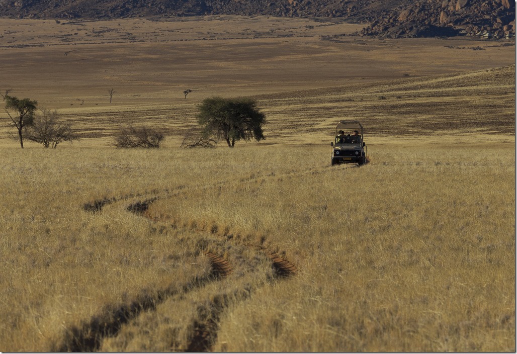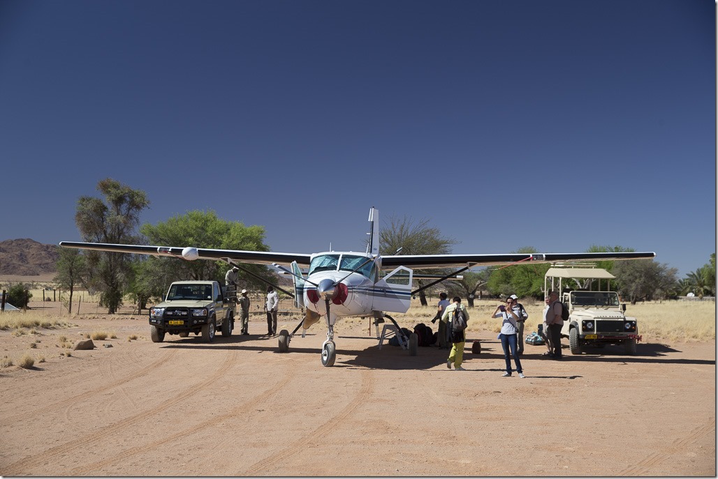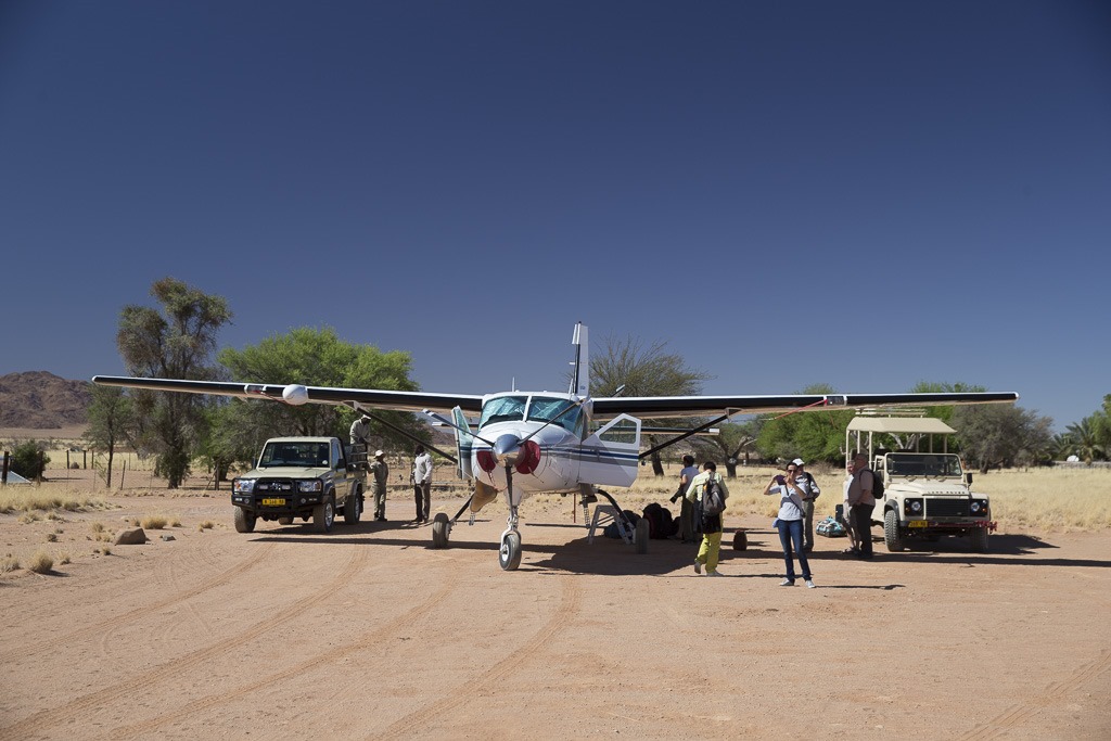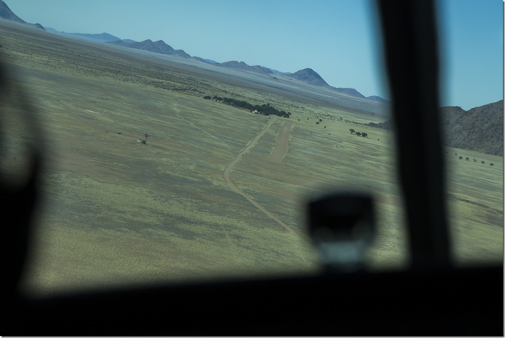 Nach dem Besuch der Dünen geht es weiter zur kleinen Landebahn in der Nähe unseren nächsten Lodge “Wolwedans”. Obwohl die Koordinaten bekannt sind, muss man oft bei diesen Grass oder Schotterpisten genau hinschauen, bis man sie ausmachen kann. Meist gelingt das trotzdem erst im letzten Augenblick. Dann dreht man zur Sicherheit zuerst einmal noch eine Runde über dem Platz.