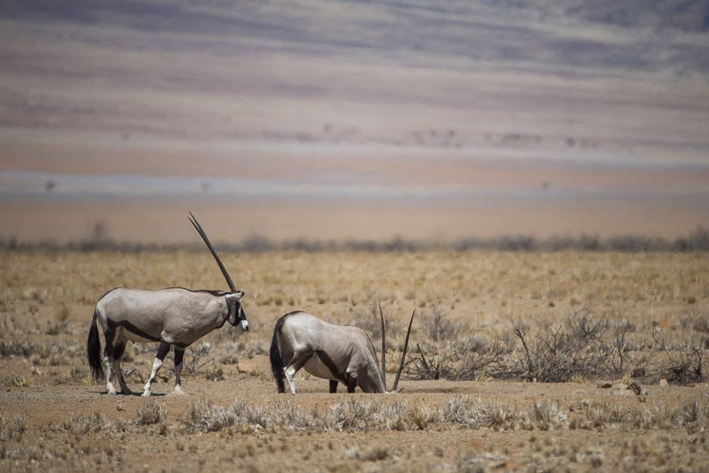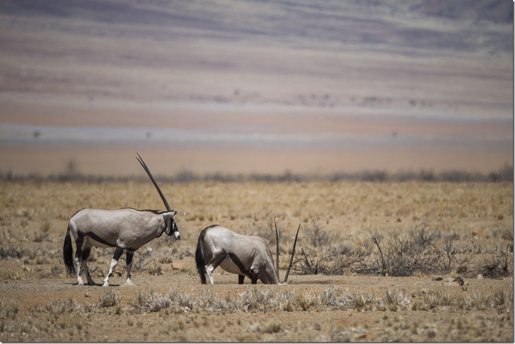 “He, Friedrich, wie ist denn das Wasser hier?” – “Schlürf, Schlürf, frisch und gut, schlürf … die sollten aber bald einmal nachfüllen, sonst müssen wir zum anderen Wasserloch gehen und da habe ich definitiv keinen Oryx drauf…” – Zufälliges Gespräch zweier Oryx beim Wasserloch unserer Lodge.