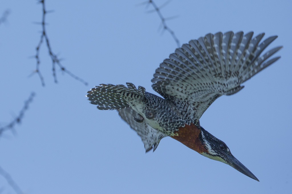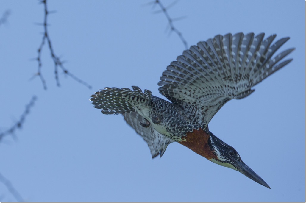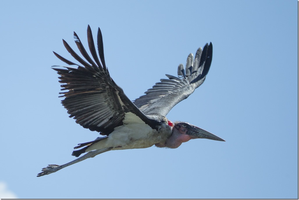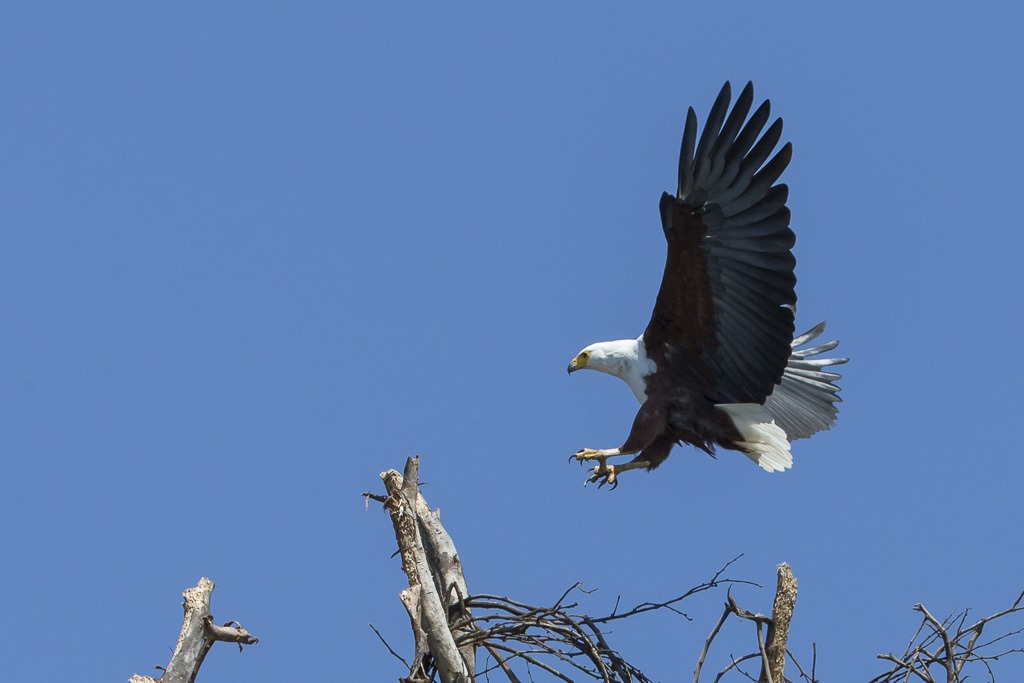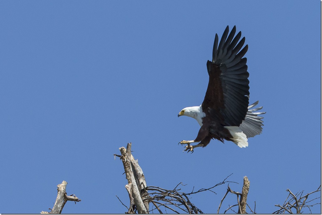 Der Versuch, einen Fish Eagle mit einem Fisch anzulocken scheiterte leider und so gibt es nur eine entfernte Flugaufnahme.