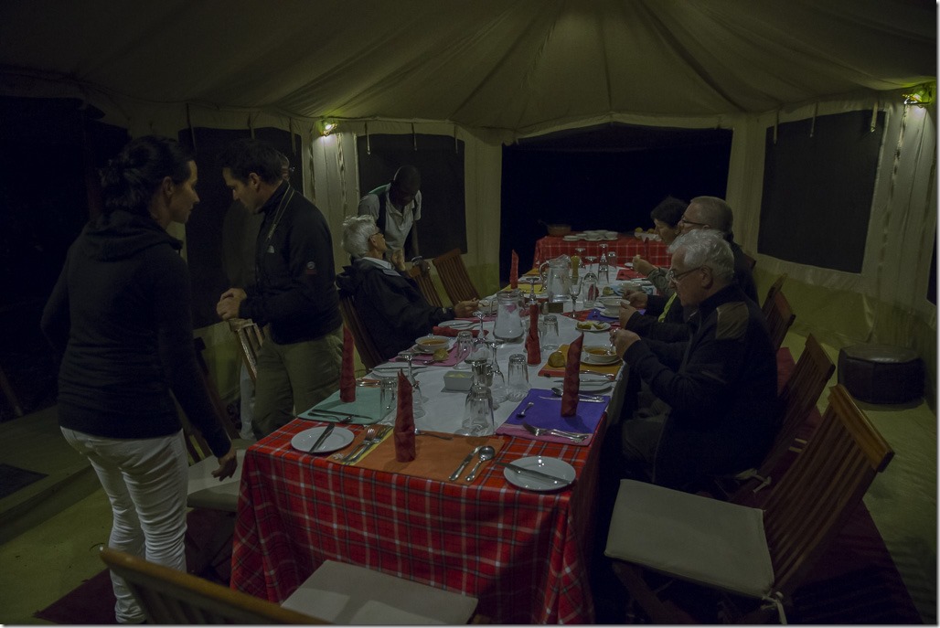 Nachdem wir in unserem Bush Camp angekommen sind, gibt es bald das Nachessen im Gemeinschaftszelt.