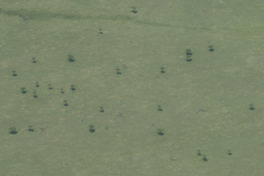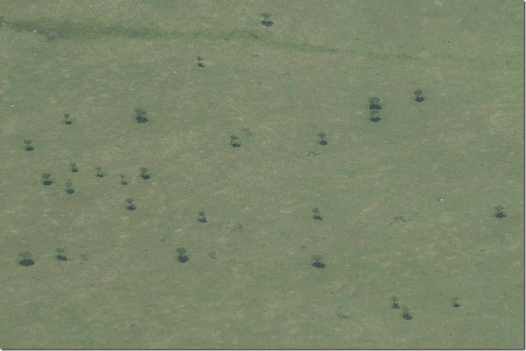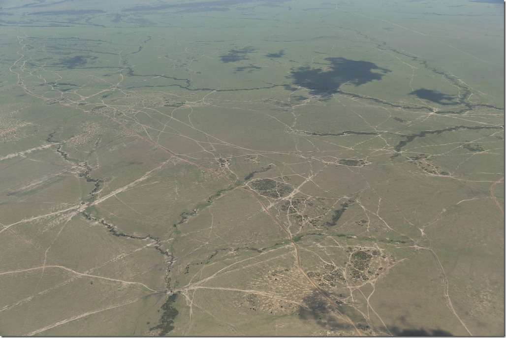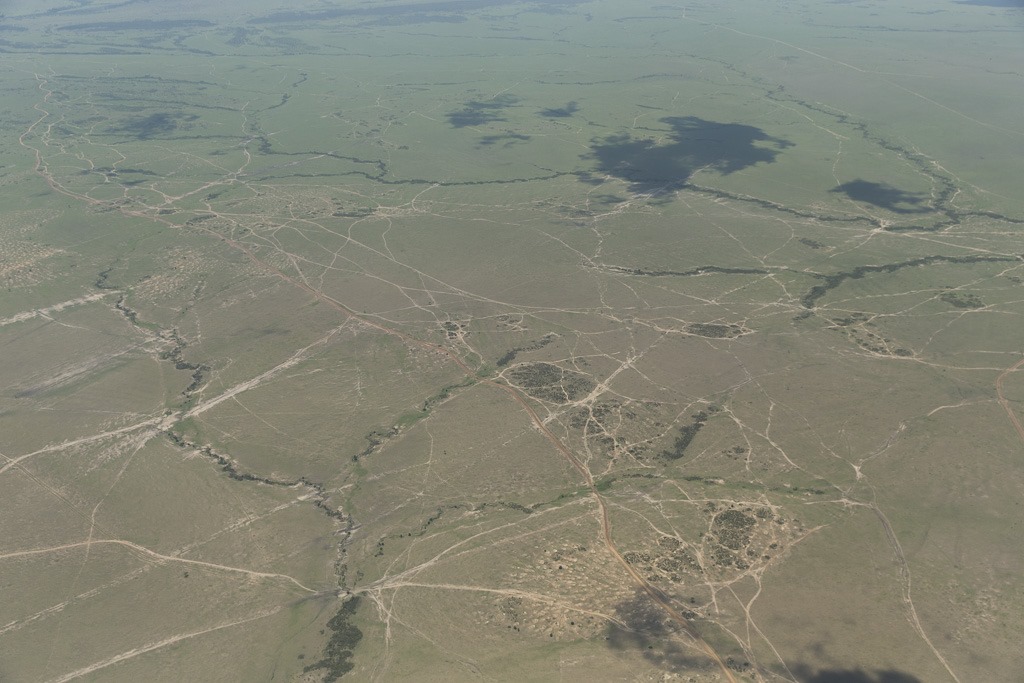 Aus der Luft sieht man deutlich, was wir gestern bei unseren beiden Game Drives schon am Boden festgestellt haben. Im Masai Mara Park wird im Gegensatz zu anderen Parks sehr häufig auch weg von den Strassen gefahren. Am frühen Nachmittag überfliegen wir auch den direkt angrenzenden Serengeti Park. Dort sind die Fahrspuren viel weniger sichtbar.